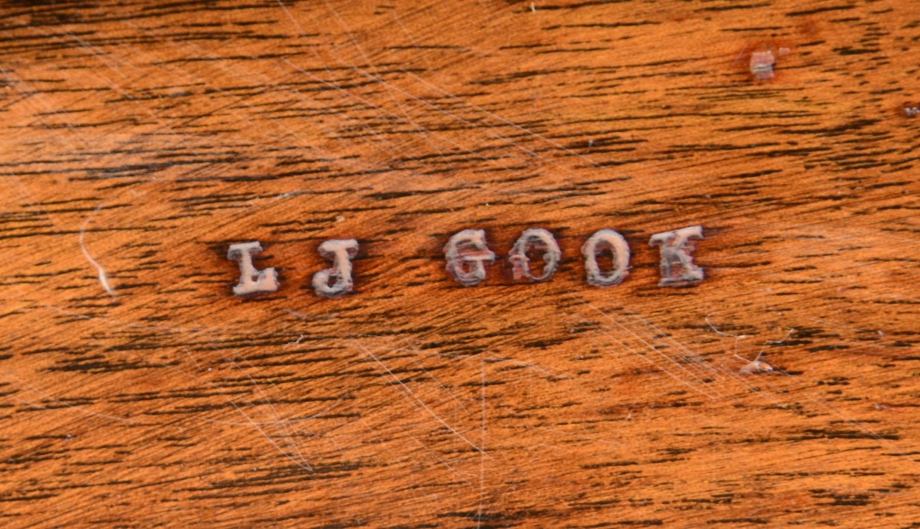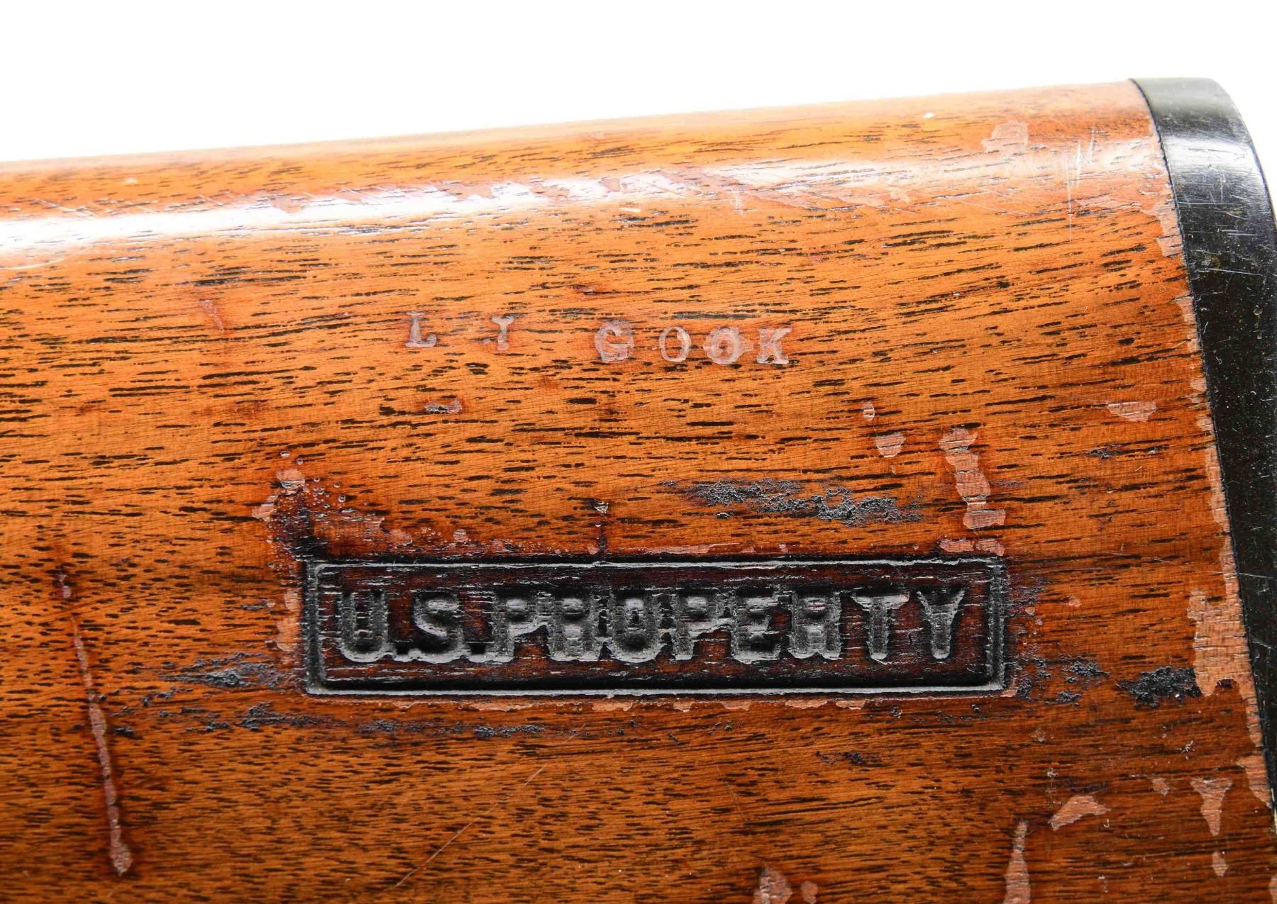 Cal. 12 Ga., 2 3/4". S# B44318. "US PROPERTY" on left side of buttstock along with "LJ GOOK" stamped on other sides of buttstock. The 30" barrels have brass bead and full choke. Boxlock action with double triggers and extractors. Checkered walnut stock set with hard rubber buttplate. CONDITION: good blue finish, showing areas of wear and residue. Good stock set with peeling finish and small gouges. Very good, shiny bores. (24-3794/MD). CURIO. $400-800.