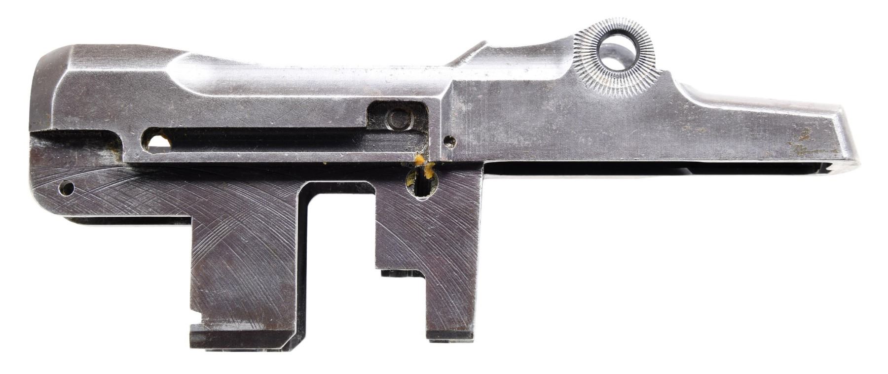 RECEIVER. S# 9365. This stripped receiver was mfg. in March 1939 and was originally assembled as a gas trap rifle. Receiver has the correct "seventh round" modification. Right forward end of the receiver is marked "NB 2 D 28291". Receiver bridge and receiver bring both have punch proof marks. UNATTACHED ACCESSORIES: copy of CMP invoice, dated "01/11/10" and a copy of CMP auction site bidding information. CONDITION: receiver retains approx. 70% of its original finish with moderate wear and scattered small spots of oxidation throughout. (24-5529/RW). MODERN. $500-700.