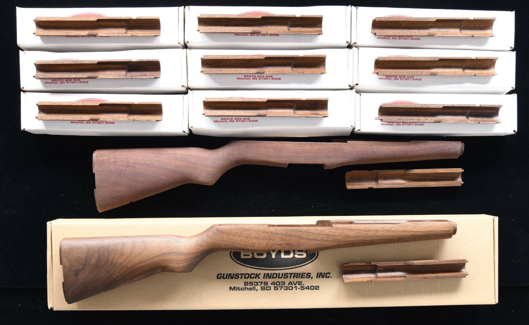 & HANDGUARDS. Many stocks are new by Boyds. NO. 1: Two Boyd's finished walnut stocks w/ factory packaging & shipping boxes. 1 is missing its front handguard. NO. 2: Ten Boyd's finished walnut rear handguards. 1 is missing its factory box. NO. 3: Two hardwood replacement stocks. 1 has complete hardware. NO. 4: Brown synthetic stock by H&W MOLDERS INC. w/ hardware. NO. 5: 4 Parade type stock sets w/ very dark (nearly back). Stocks are without metal fittings & have the 5/8" spacer 1 1/2" behind stock tip. CONDITION: condition ranges from new in box to moderately worn, but serviceable. (02-23230-3/RW). NON-GUNS. $700-900.