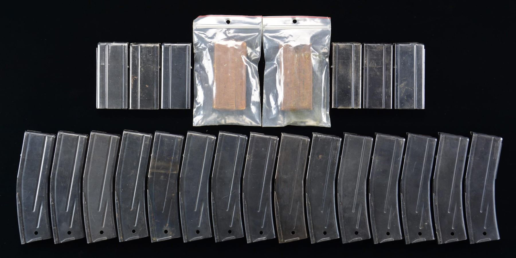 This lot consists of the following M1 Carbine mags all housed in a USGI 50 cal. ammo can: 1) Fifteen varied 30 rd. mags. Most mags are marked "AYP" denoting they are of Belgian mfg. Some are unmarked & others marked "MADE IN USA". 2) Eight varied 15 rd. mags that appear to be mostly of USGI mfg. Two mags are sealed in wrapper & others are loose. CONDITION: mags appear generally serviceable but show storage wear & some light oxidation. (02-23233-2/MJC) $200-400 for lot.