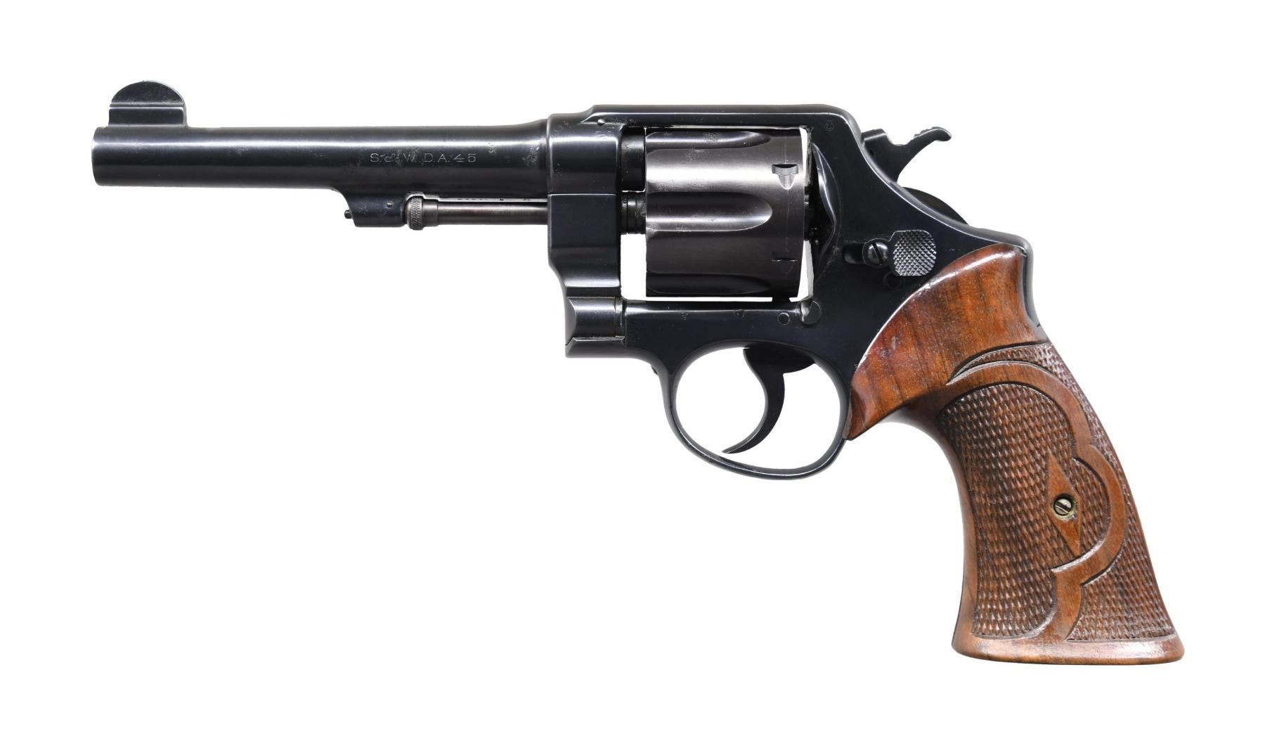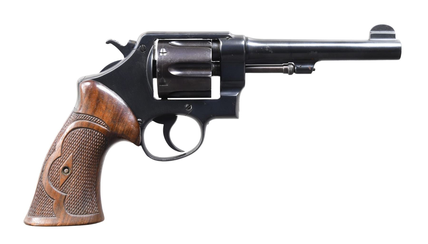REVOLVER. Cal. 45 ACP. S# 91311. Bbl. 5 1/2". U.S. Army Model of 1917 double action revolver mfg. by Smith & Wesson. Left side of the bbl. is marked "S&W D.A. 45," with "UNITED STATES PROPERTY" marked on the underside. Left side of frame is marked with an eagle head over "S4", with an eagle head over "S23" present next to the assembly number on the interior of the frame. Butt is marked "U.S./ ARMY/ MODEL/ 1917" above the S#. Metal components exhibit a reapplied blue finish overall. Frame is mounted with 2-piece aftermarket checkered wood grips. Lanyard loop on butt has been removed. Hammer has had several notches carved into it. Half-moon blade front sight, with frame notched rear sight. All serialized parts are matching and include the frame, cyl., ejector, and bbl. Frame and cyl./cyl. crane fit is poor. CONDITION: metal components retain bountiful amounts of their reapplied blue finish, exhibiting scattered areas of pitting and a few spots of oxidation overall. Fair bore, exhibiting consistent pitting while retaining good rifling throughout. Grips show some minor marks and impressions from handling and storage but otherwise remain sturdy and serviceable. (24-4425/MLW). CURIO. $200-300.
