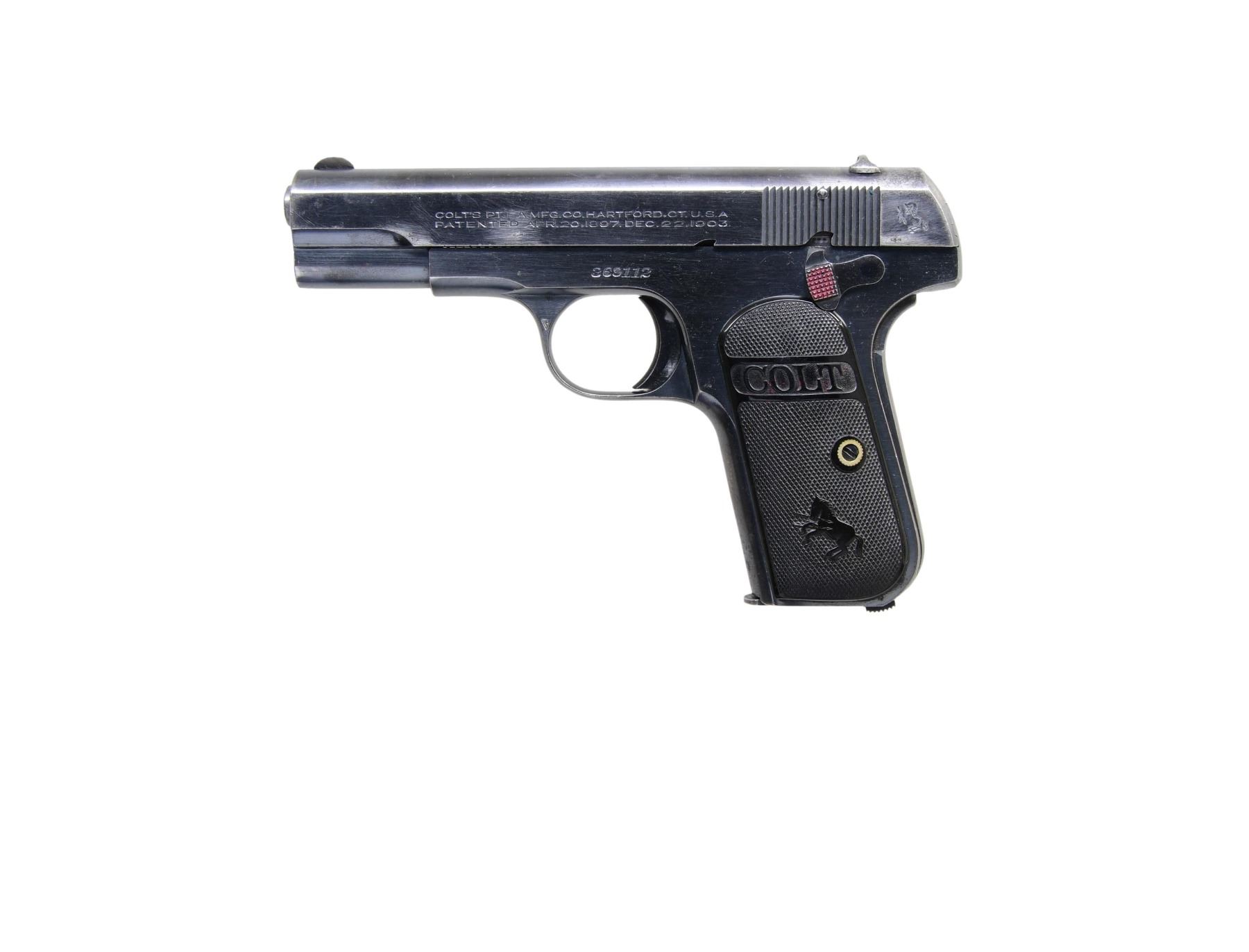 Cal. 32 ACP. S# 369112 (1920). This Colt Model 1903 features a blued finish with a 3 7/8" barrel. The front sight is a fixed blade, and the rear sight is a rounded notch. The frame has a standard configuration with the safety on the left side and the magazine release located on the bottom of the grip. The grips are checkered hard rubber with Colt medallions. MAGS: 1-8 Rds. CONDITION: Overall condition is good with approximately 70% of the blued finish remaining on the slide and 65% on the frame. The bore is clean with strong rifling. PROVENANCE: From the Collection of a Tennessee Gentleman. (24-4540/BH) CURIO. $600-$800.