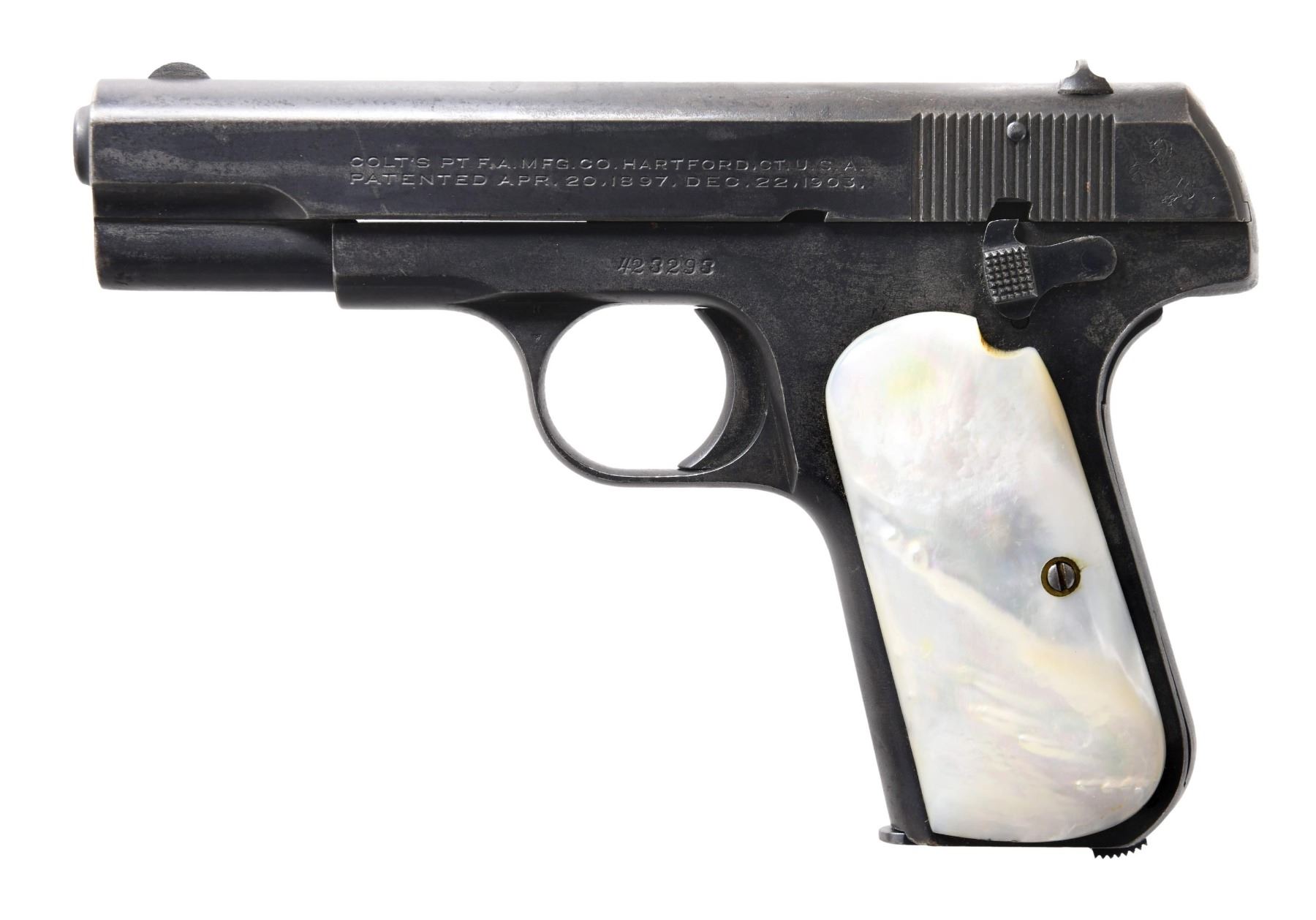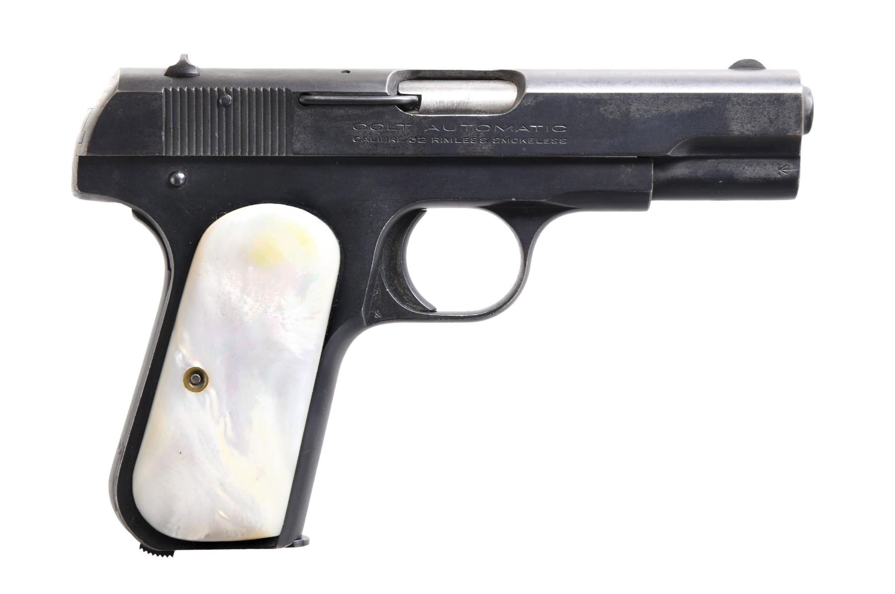 Cal. 32 ACP. S# 423293. Bbl. 3 3/4". Model 1903 Hammerless semi-automatic pistol mfg. by Colt in 1923. Left side of the slide is marked with Colt's mfg. and patent information, followed by the Rampant Colt logo, with the cal. designation marked on the right. Metal components exhibit a blue finish overall. Frame is mounted with 2-piece pearl grips. Slide matches the frame via the full S#, which is stamped on the interior of the rear slide well. MAGS: 1 reblued 8-rd. CONDITION: metal components retain large amounts of their original factory blue finish, exhibiting some areas of wear and thinning that show through to gray and brown patinas, with light to mild surface oxidation present overall. Bright bore, exhibiting some light pitting, while retaining good rifling throughout. Grips show some superficial handling marks, with a minute chip present on the bottom of the right panel, but otherwise remain sturdy and serviceable. (24-4983/MLW). CURIO. $450-650.