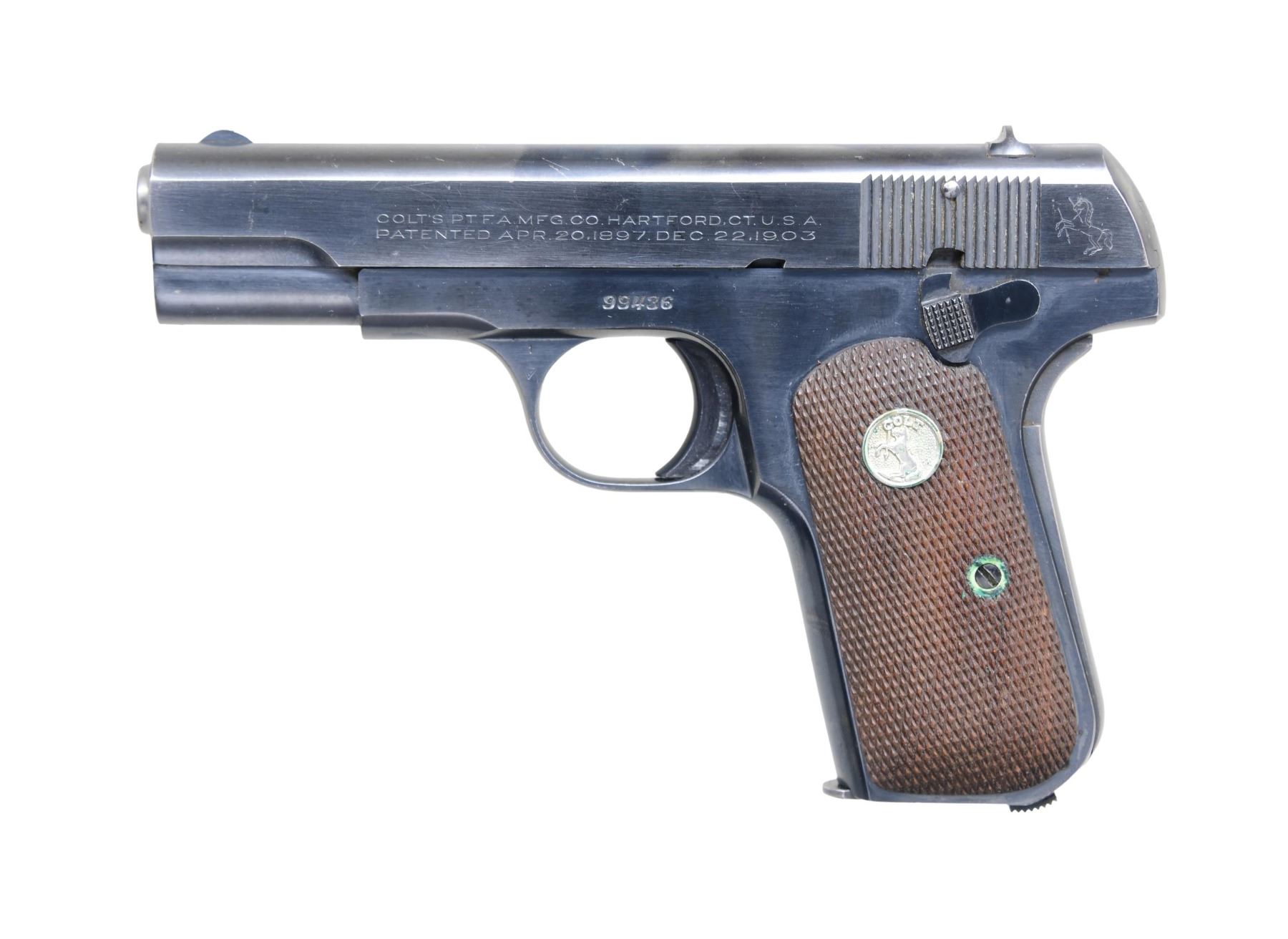 Cal. 380 ACP. S# 99436 (1929). This Colt Model 1908 features a blued finish. The barrel length is 3.75 inches. It has a fixed front sight and a notched rear sight. The frame includes a left-side safety lever. The grips are checkered walnut with Colt medallions. MAGS: 1-8 Rds. CONDITION: Overall condition is good with about 85% of the original blued finish remaining on the slide and frame; front strap shows wear & patina. The bore shows wear with some pitting. CURIO (24-4120/MD) $500-$700.