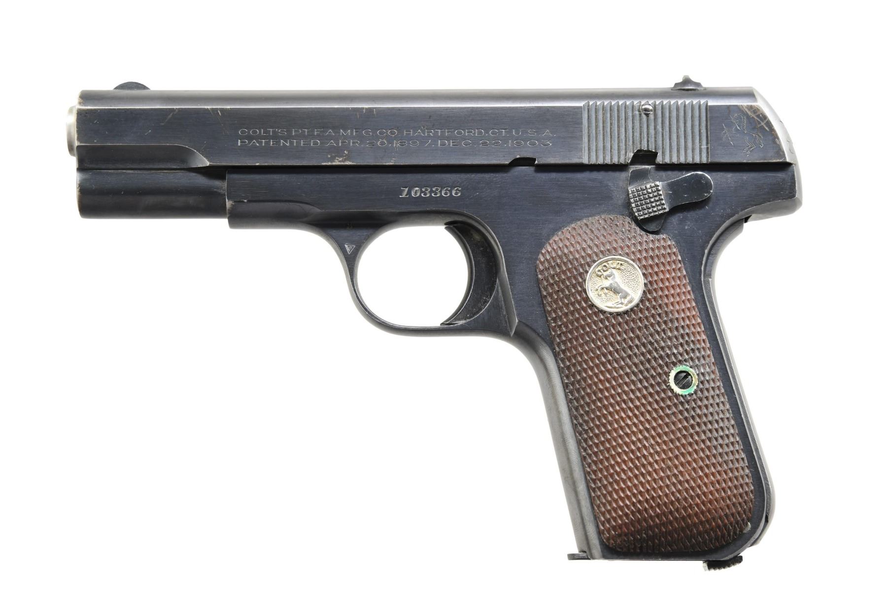 Cal. 380. S# 103366. Bbl. 3 3/4". Model 1908 Hammerless semi-automatic pistol mfg. by Colt in 1930. The left side of the slide is marked with Colt's mfg. and patent information, followed by the Rampant Colt logo, with the cal. designation marked on the right. Metal components exhibit a blue finish overall. Frame is mounted with 2-piece Colt silver medallion checkered wood grips. Half-moon blade front sight, with square notch rear sight. Matching numbers are present on the frame and slide. MAGS: one 7-rd. CONDITION: metal components retain the majority of their original factory blue finish, exhibiting some light to mild edge wear, a few small spots of wear and thinning, as well as scattered marks and scratches from handling and storage overall. Bright bore, exhibiting light pitting while retaining well-defined rifling throughout. Grips show some light to mild smoothing, as well as a few nicks to the diamonds from handling and storage, but otherwise remain sturdy and serviceable. (24-5652/MLW). CURIO. $600-900.