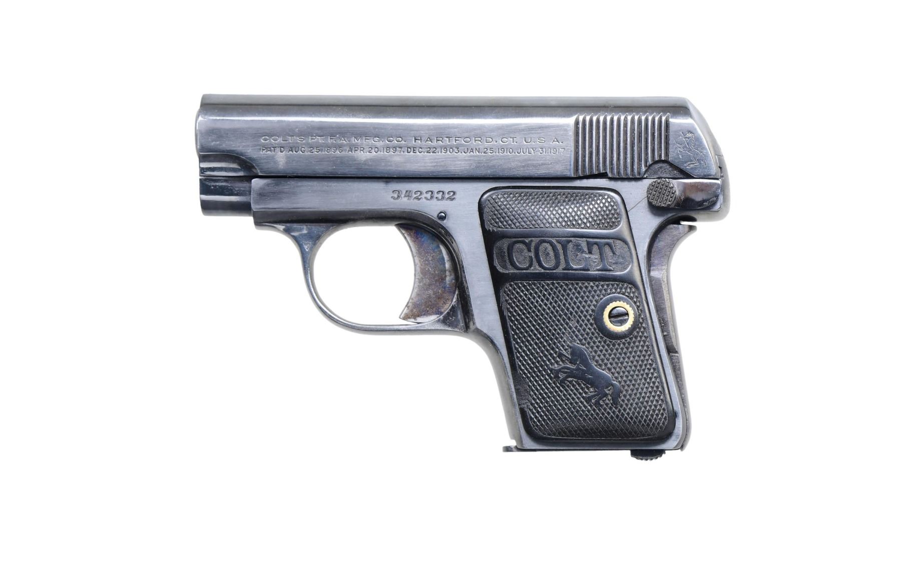 Cal. 25 ACP S# 342332. This example features a reblued finish with a 2-inch barrel and fixed sights. The left side of the slide is marked "COLT AUTOMATIC CALIBRE .25" and the right side with the Colt's Manufacturing address and patent dates. The frame features a standard configuration with checkered black hard rubber grips, each with the Colt logo and a rearing colt emblem. MAGS: 1-6 Rds. CONDITION: Good overall, with approximately 60% of the reblued finish remaining on the slide and frame, showing some wear and thinning. The bore is worn with visible rifling. CURIO. (24-4700/MD) $200-300.