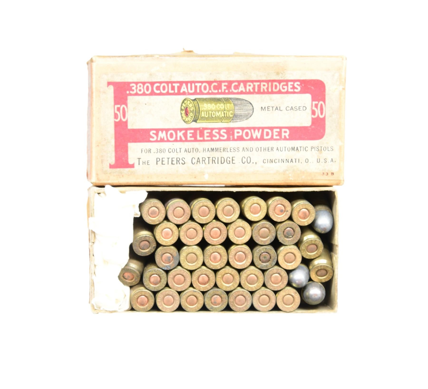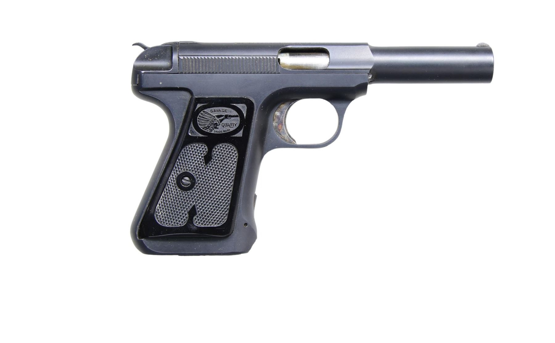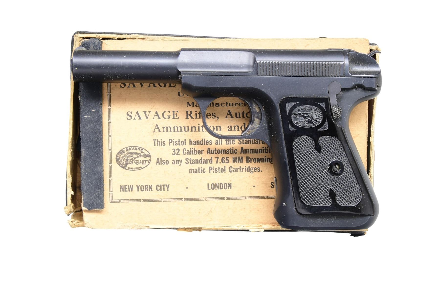 Cal. 9mm (380 ACP). S# 28587B. Features include a blued finish, 3 13/16" barrel, fixed sights, standard trigger, and hammer. The grips are checkered black plastic with Savage medallion. MAGS: 1 factory magazine with a 7-round capacity. UNATTACHED ACCESSORIES: Factory box and 40 rounds of Peters .380 Colt Auto ammunition. CONDITION: Overall very good condition with approximately 90% of the reblued finish remaining on the barrel and frame. The grips are excellent with minimal handling marks. Good bore. CURIO. (24-4130/MD) $300-400.