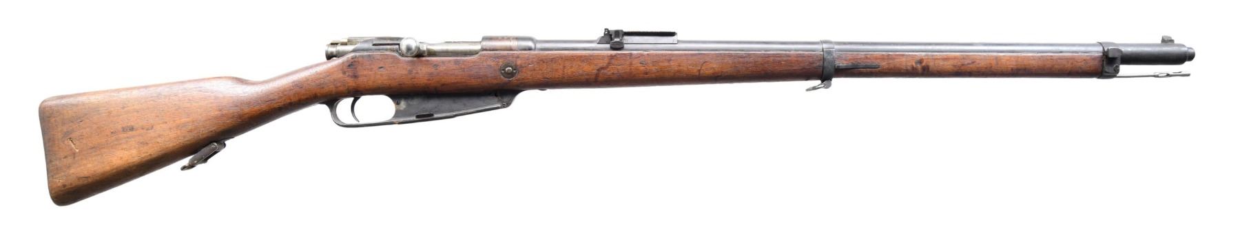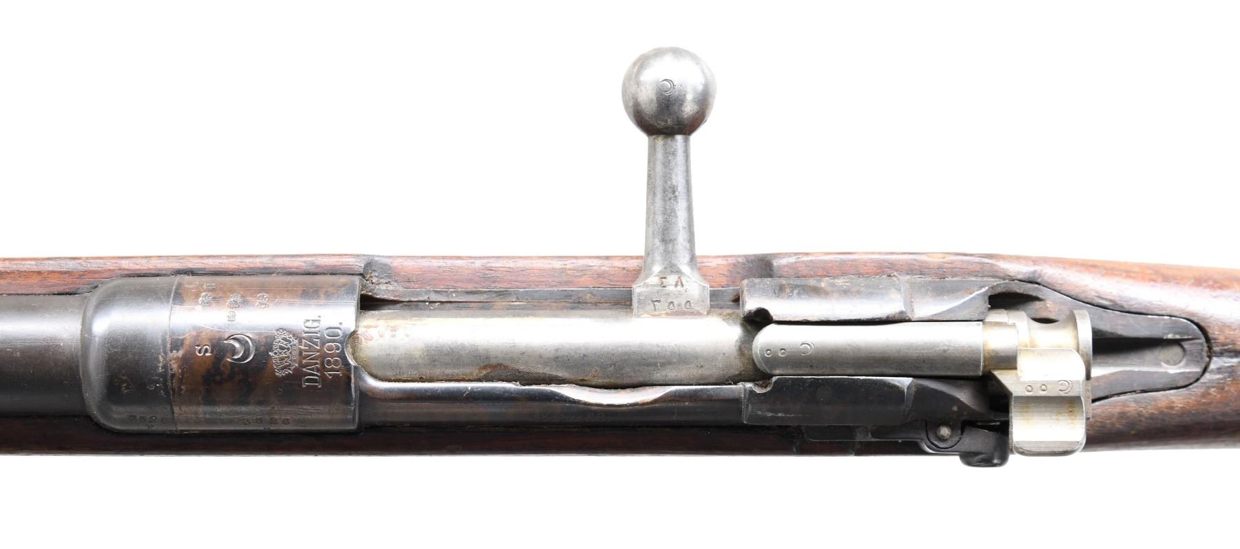 Cal. 8mm Mauser. S# 3526r. Bbl. 29". Blade front sight. Ladder rear sight graduated to 2000m. Turkish-issued Gew 88/05 with stripper clip guides. Matching numbers on receiver and bbl. jacket; other visible parts are mismatched with bolt having Turkish numbers. Receiver has Turkish crescent moon, Imperial crown, and "DANZIG 1890" markings. Turkish arsenal-blued finish. Hardwood stock set with bottom-mounted sling swivels and faint Imperial markings. Cleaning rod is present. CONDITION: stock set has an arsenal rework appearance with scattered dings and handling marks. Metal retains 60% Turkish arsenal-reworked blue with scattered fading, edge wear, oxidation, and a few patches of pitting. Action functions properly when hand-cycled. Bore shows scattered frosting and pitting but evident rifling. (01-25997/MJC). ANTIQUE. $200-300.