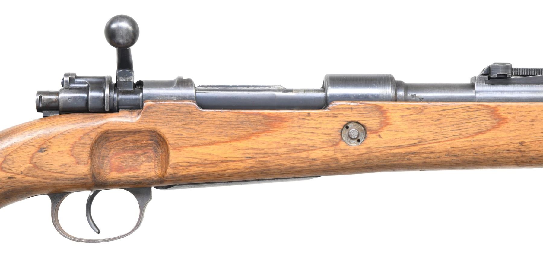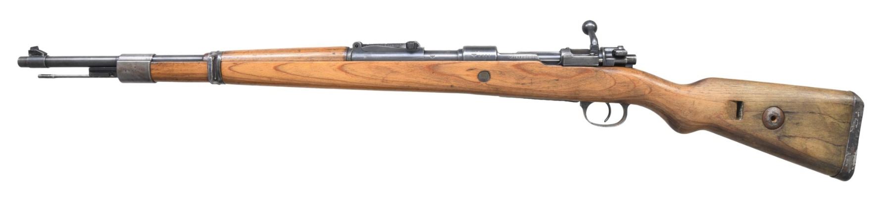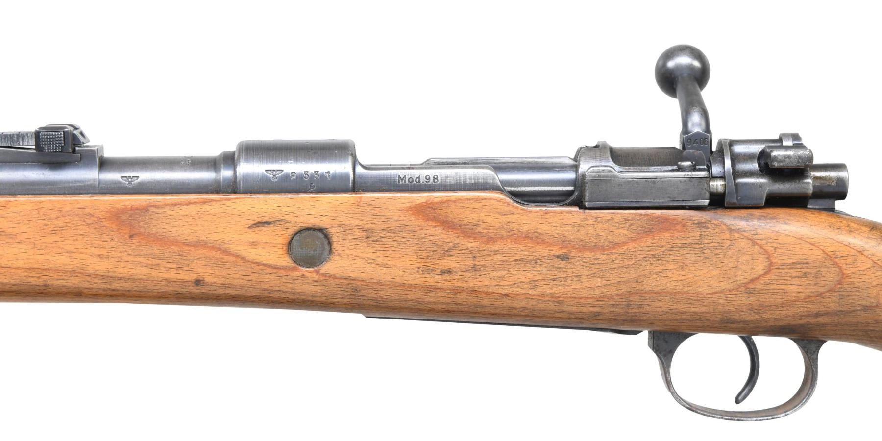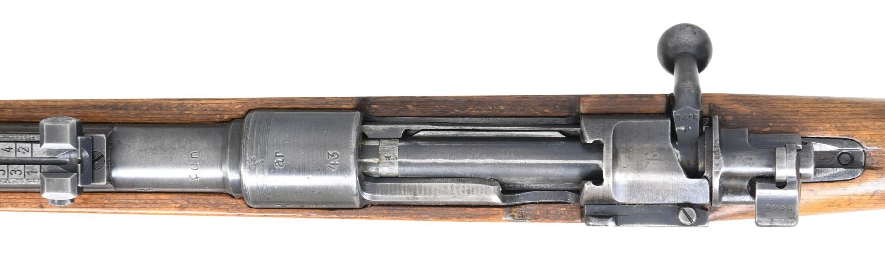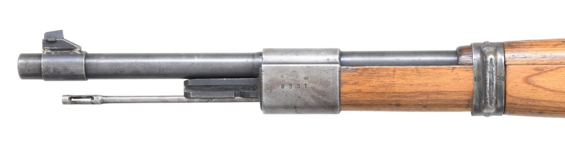 MILITARY RIFLE. Cal. 8MM Mauser. S# 8331k. Serial numbers match on all but bolt assembly. Bbl. 23 5/8". Barrel marked on top of chamber "ar -4- on". Marked on left side with German eagle proof. Receiver is marked on top "eagle 10" over "ar" and "43". Receiver marked on left side eagle proof and "Mod. 98". Tangent rear sight graduated to 2000 meters. Inverted V front sight. Bolt with turned down handle. Milled trigger guard and floor plate. Cleaning rod and bayonet bar are present. Laminated stock set is unmarked. Cup type buttplate. Stamped lower band. Milled solid upper band. CONDITION: stock set has an arsenal rework finish with added finish. The butt has a scorched appearance with loss of finish. The metal parts retain about 50% of the original blue with wear turning grey. Take down disk and buttplate have a mottled appearance from the scorching. Bore has lightly worn lands with light frosting in grooves. (24-4167/RW). CURIO. $300-500.