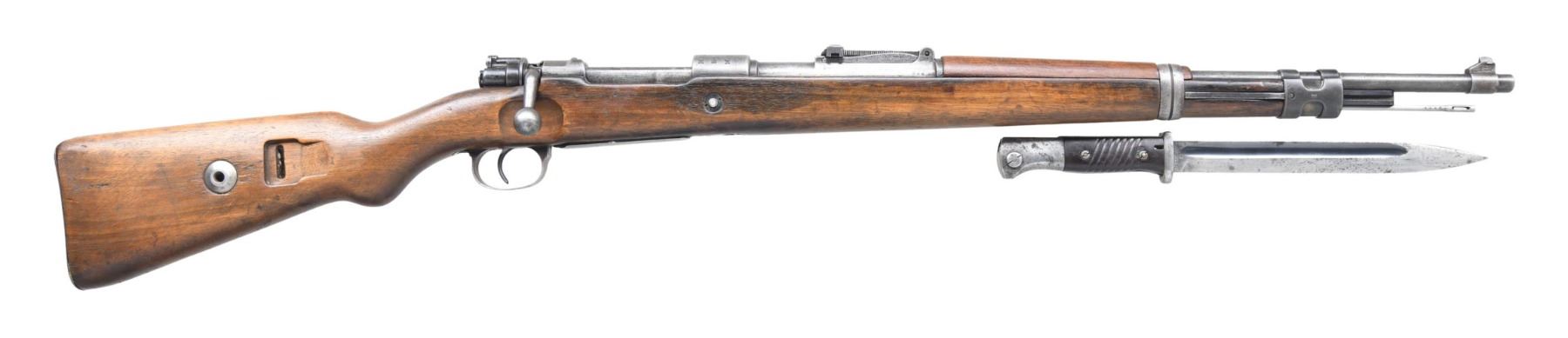 RIFLE. Cal. 8x57 (8mm Mauser). S# 894. Bbl. 23 1/2" with Century import marking. Tangent rear sight graduated to 2000m. Matching numbers on receiver, bbl., and front sight; other parts are mismatched or unnumbered. Receiver top has "S/243 1937" markings, denoting Mauser Borsigwalde mfg. in 1937. Walnut stock set with left side sling provisions. Replacement non-German cleaning rod present. UNATTACHED ACCESSORIES: S/155 coded S84/98 bayonet that shows scattered cleaned areas and oxidation. No scabbard is present. CONDITION: stock set has an arsenal-refinished appearance with scattered dings, black staining, and handling wear. Metal is a silvery-gray color with scattered oxidation, some pitting, and dings. Action functions properly when hand-cycled. Poor, heavily worn bore with scattered oxidation. (24-4740/MJC). CURIO. $500-800.