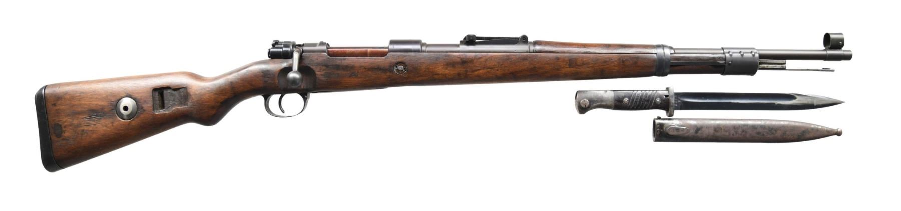 Cal. 8x57 (8mm Mauser). S# 673f. Bbl. 23 1/2". Blade front sight with sight hood. Tangent rear sight graduated to 2000m. Mismatched numbers throughout. Rifle appears to be a post-war rework but lacks Russian "X" markings or electro-penciled numbers. Receiver top has "bcd 42" markings, denoting mfg. by Gustloff Werke in 1942. Arsenal rework-type blue finish with plum-colored extractor. Hardwood stock set. Cleaning rod is present. UNATTACHED ACCESSORIES: clc1942 code 84/98 bayonet with mismatched scabbard. Scabbard shows oxidation throughout. Bayonet shows areas turning gray with scattered oxidation. CONDITION: stock set has an arsenal-refinished appearance with added oil, some dings, and handling marks. Metal retains 95% arsenal rework type bluing with some pitting on bolt stop, further blued-over pitting, and some light dings on bottom metal. Action functions properly when hand-cycled. Bore shows scattered pitting and frosting but has evident rifling. (24-4745/MJC). CURIO. $500-800.