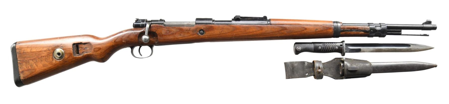 RIFLE. Cal. 8x57 (8mm Mauser). S# 581a. Bbl. 23 1/2" with TGI import marking. Blade front sight without hood. Tangent rear sight graduated to 2000m. Matching Soviet applied numbers on left side of butt, trigger guard, and floorplate. Other parts have mixed numbers. Receiver top has eagle "WaA80" and "dou 43" markings denoting mfg. by Waffen Werke Brunn II in occupied Czechoslovakia in 1943. Soviet arsenal-rework blue finish. laminated stock set with left side sling provisions. Cleaning rod present. UNATTACHED ACCESSORIES: 1938 Carl Eickhorn S84/98 bayonet with leather frog and unnumbered scabbard. Bayonet and scabbard show scattered oxidation. Frog shows scattered crazing. CONDITION: stock set has Soviet arsenal rework finish with a notable chip above bolt cutout, some light chipping around buttplate, and scattered flaking and handling wear. Bolt body appears in-the-white that is turning gray with scattered oxidation and light pitting. Balance of metal retains 93% of its Soviet arsenal-reworked blue with some edge wear and blued-over oxidation. Action functions properly when hand-cycled. Bore has scattered frosting and pitting but strong rifling. (24-4748/MJC). CURIO. $600-900.