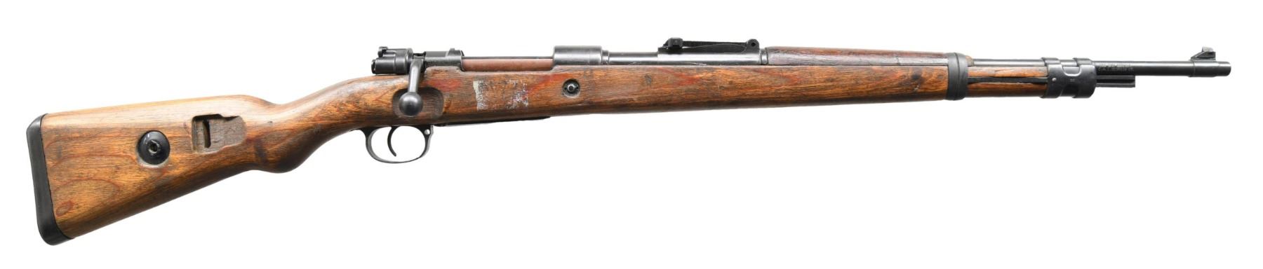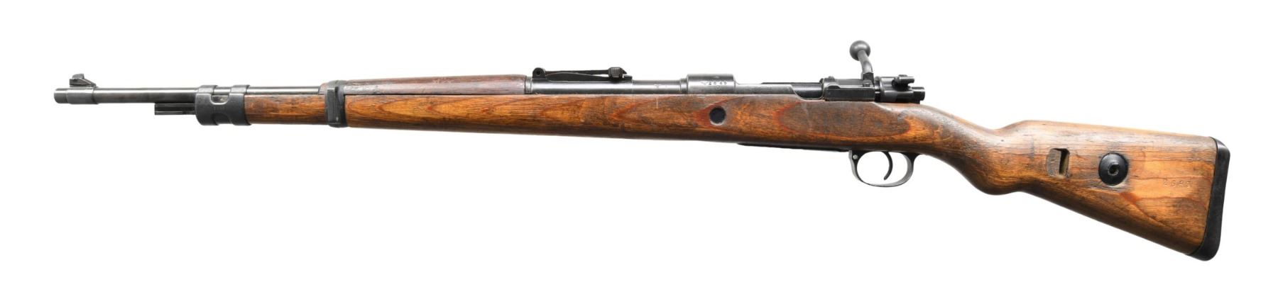 ACTION RIFLE. Cal. 8mm Mauser. S# 2649o. Bbl. 23 1/2" with Century import marking. Blade front sight. Tangent rear sight graduated to 2000m. Matching Soviet number on left side of butt; other parts are unnumbered or mismatched. Receiver top has "dou 43" markings denoting 1943 mfg. by Waffen Werke Brunn II in German-occupied Czechoslovakia. Left side of receiver has Soviet "X" marking. Sight hood, cleaning rod, and locking screws are missing, as is typical for Soviet-captured rifles. Arsenal-reworked blued finish. Laminated stock set with cupped buttplate and left side sling provisions. CONDITION: stock set has the scattered remnants of Soviet shellac and has the remnants of a white sticker on the right side. Stock otherwise shows some chipping behind the upper tang, dings, and handling marks. Metal retains 97% Soviet arsenal-reworked blue with some dings and edge wear. Action functions properly when hand-cycled. Bore shows scattered oxidation and some pitting but strong rifling. (24-5407/MJC). CURIO. $400-600.
