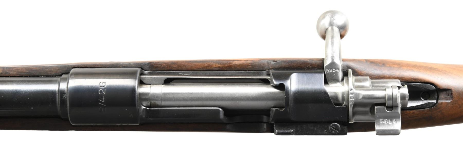 Cal. 8x57 (8mm Mauser). S# 5954f. Bbl. 23 1/2" with Mitchell's Mausers import marking. Blade front sight. Tangent rear sight graduated to 2000m. Matching original numbers on receiver, bbl., and front sight. Left side of butt, bolt parts, trigger guard, floorplate, and both bands renumbered to match likely by importer. Other parts are unnumbered or mismatched. Receiver top has "S/42G" marking denoting mfg. by Mauser Oberndorf in 1935. Bolt assembly, buttplate, and takedown disc are all polished to bright. Other parts have reblue finish that appears to be importer done. Banner K style stock with grasping grooves and left side sling provisions. Brightly finished cleaning rod is present. UNATTACHED ACCESSORIES: matching-numbered Mitchell's certificate and manual. CONDITION: refinished stock set shows an armorer-type patch repair and some chipping near the band keeper; the stock set otherwise shows some black staining and handling wear. Brightly finished parts show some light pitting and oxidation. Balance of metal retains 95-97% reblue with some light edge and handling wear. Action functions properly when hand-cycled. Good, bright bore, with some scattered light pitting but strong rifling. (24-4741/MJC). CURIO. $500-800.