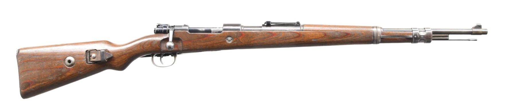 Cal. 8x57 (8mm Mauser). S# 827n. Bbl. 23 1/2". Blade front sight. Tangent rear sight graduated to 2000m. Cleaning rod is unnumbered, and bolt parts are mismatched, but all other visible numbers are matching to the receiver. Early war Luftwaffe issued K98k made by Mauser Oberndorf. Receiver top is marked "42/1940", denoting 1940 mfg., and receiver markings have white highlight paint. Parts have correct "(Eagle)/655" and "(Eagle)/63" Waffenamts. Blued finish. Laminated stock set with left side sling provisions and K98k-style sling. Right side of butt has "(Eagle)/L" Luftwaffe marking and two "(Eagle)/WaA655" Waffenamts. Stock also has two plugged sling stud holes on the underside of the butt and one on the forend. CONDITION: stock set shows some band removal wear, scattered flaking armory oil finish, dings, and handling wear. Metal retains 30% original blue with overall fading to gray, a couple deep slashes on underside of rear sight leaf, and some scattered light oxidation. Action functions properly when hand-cycled. Bright, very good bore. (24-4743/MJC). CURIO. $800-1,200.