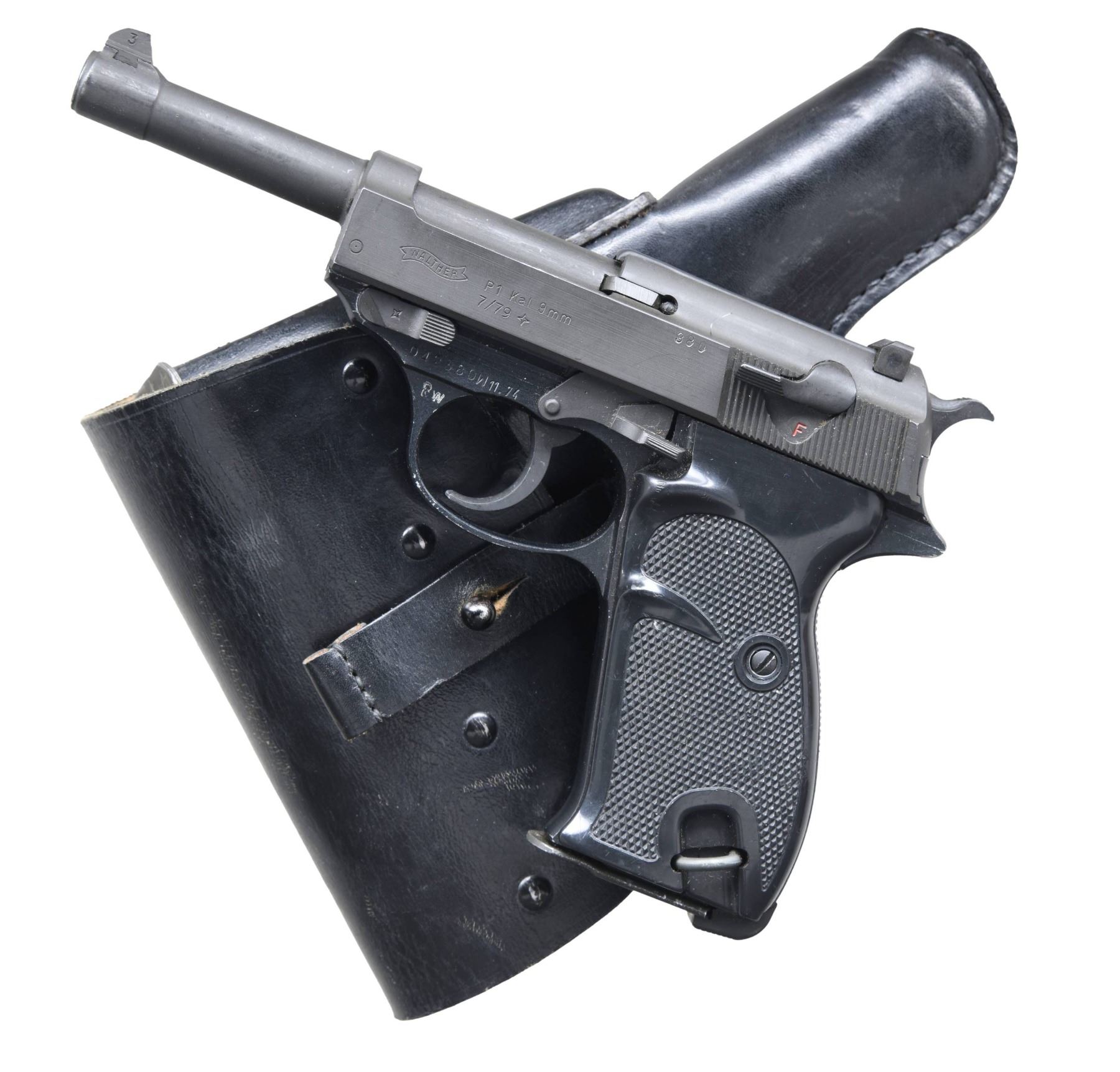WITH HOLSTER. Cal. 9mm Luger. S# 042380. Bbl. 4 7/8". P1 semi-automatic pistol mfg. by Walther. Left side of the slide is marked with the Walther banner logo, followed by the model and cal. designations, "7/79" date, as well as the last three digits of the S#, with the right side exhibiting a Bundeswehr proof, followed by a Century Arms import mark. Left side of the frame is marked with the S#, followed by "W11.74" above a "Pw" stamp, with Bundeswehr proofs marked on the right. Aluminum frame exhibits a black anodized finish, with steel components exhibiting a phosphate finish overall. All serialized parts are matching and include the frame, slide, and bbl. The bbl. has been renumbered at one time to match. MAGS: two 8-rd. mags.; one is marked for the P.38 pistol. UNATTACHED ACCESSORIES: black leather holster marked "12-120-6169/ B. MEYER GRONAU" above a Bundeswehr proof". CONDITION: metal components retain the majority of their original factory finishes, exhibiting some light wear as well as some superficial handling marks overall. Mirror bore, exhibiting a few small spots of light pitting towards the muzzle while retaining well-defined rifling throughout. Grips show some smoothing as well as scattered marks from handling and storage, but otherwise remain sturdy and serviceable. Holster remains malleable and exhibits some scattered marks from handling and storage. (24-5486/MLW). MODERN. $200-400.