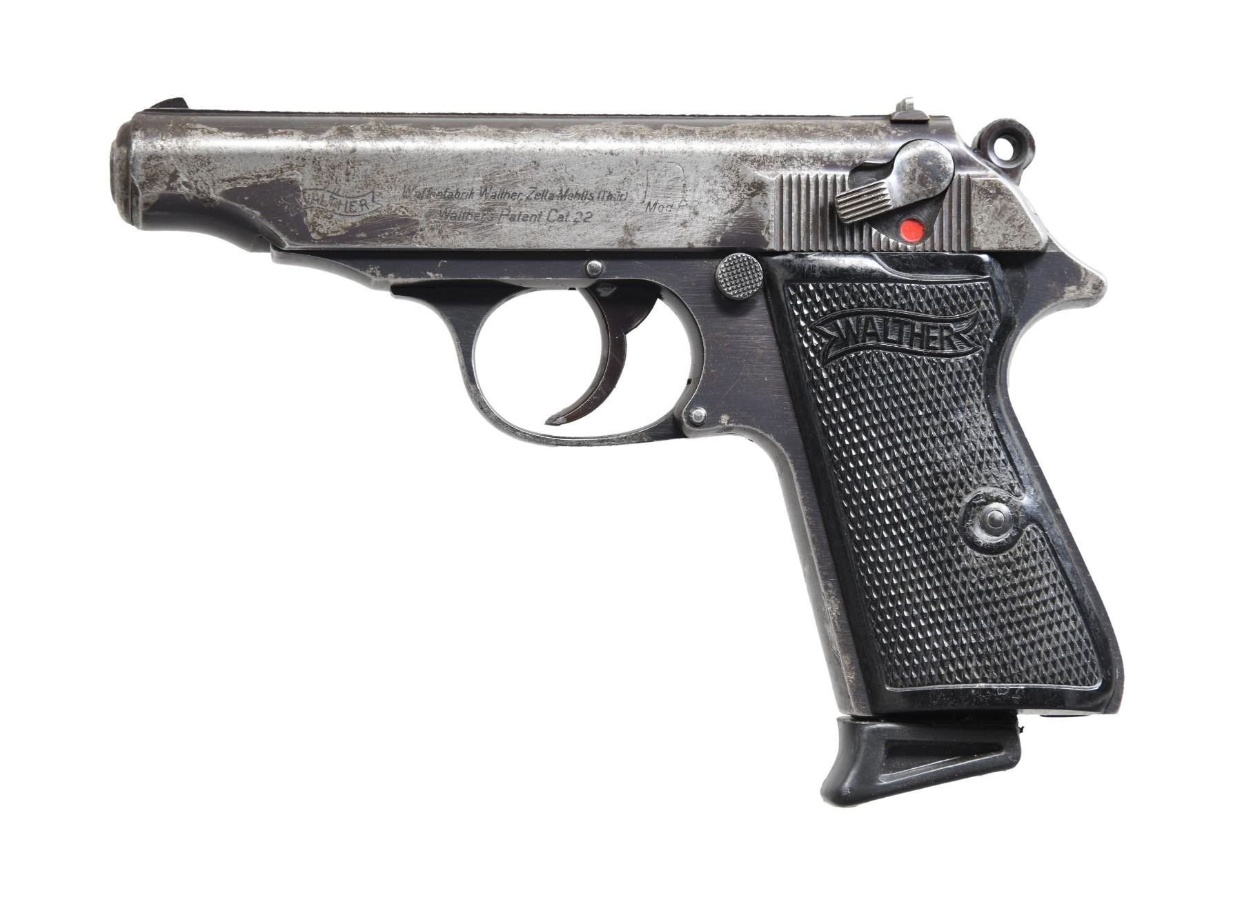 SEMI-AUTOAMTIC PISTOL. Cal. 22 LR. S# 248004p. Bbl. 3 7/8". Model PP chambered in .22 LR mfg. by Walther, circa. 1942. Left side of the slide is marked with the Walther banner logo, followed by markings stipulating Walther's mfg. information as well as the model and cal. designations. Right side of frame and slide exhibit the full S#. Metal components exhibit a blue finish overall. Frame is mounted with 2-piece Walther banner checkered black plastic grips. Grooved rib with blade front sight and U-notch rear sight. Extractor is absent. MAGS: one 10-rd. with later production black plastic grip extension. CONDITION: metal components retain large amounts of their original factory blue finish, with areas (primarily on the slide) of finish loss and pitting present overall. Safety lever is loose and requires tightening for consistent functionality. Bright bore, exhibiting scattered areas of pitting while retaining strong rifling throughout. Grips show smoothing and scattered marks from handling and storage, but otherwise remain sturdy and serviceable. (24-4069/MLW). CURIO. $400-600.
