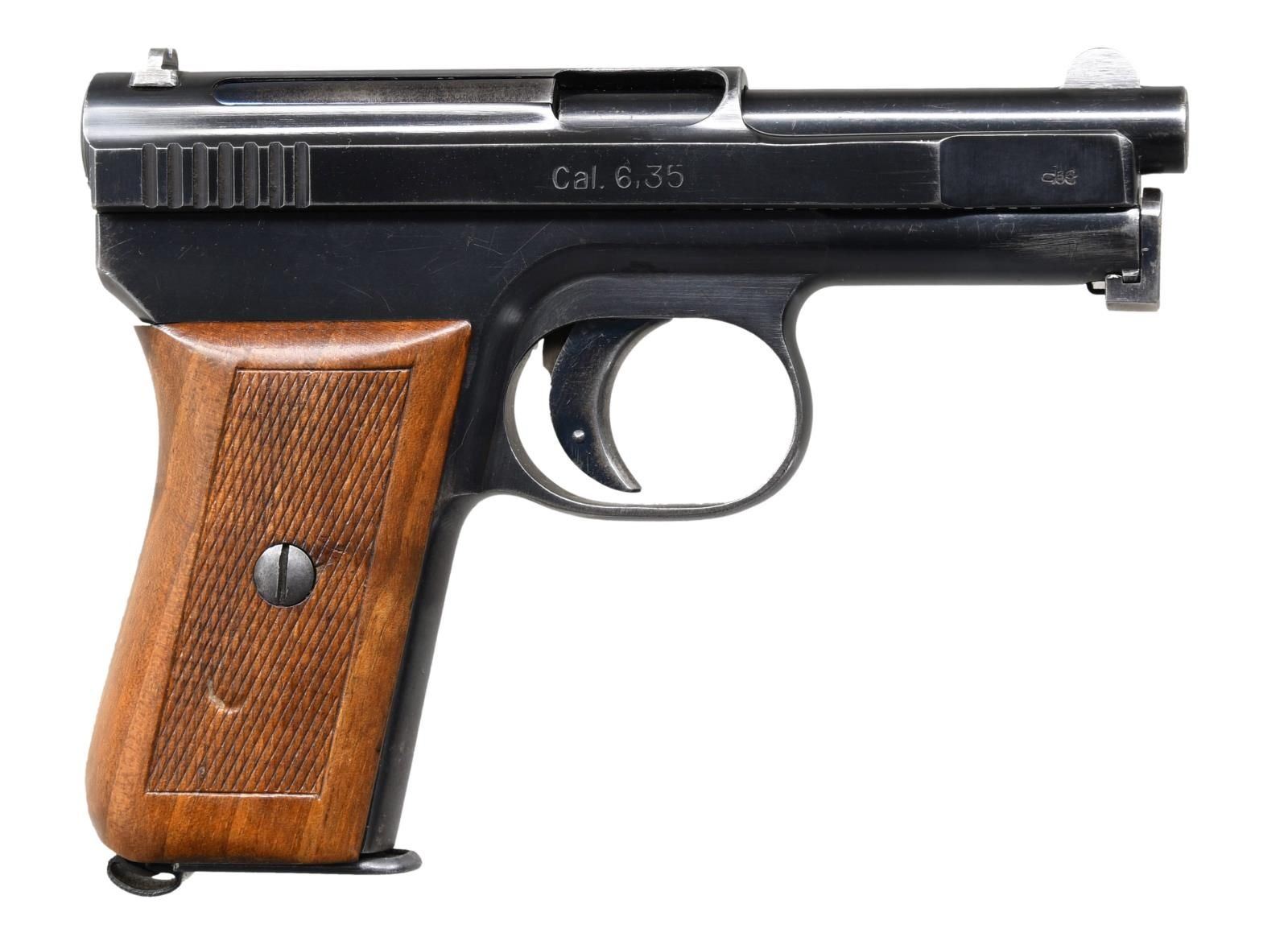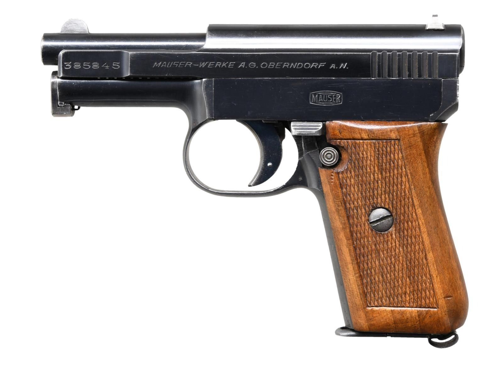 Cal. 6.35mm (25 ACP). S# 385845. Bbl. 3". Round blade front sight. V-notch rear sight. Fine condition Mauser 1910 retains a high degree of original blue finish. The right side of the frame is marked with a Mauser banner. Left side of the slide is marked "Cal. 6,35" and a crown "U". Checkered walnut grips. MAGS: 1-9 rd., marked with the Mauser banner on the baseplate. CONDITION: right side of grip shows a dent; grips otherwise show scattered dings and handling wear. Metal retains 85% of its original blue with a couple spots of oxidation, scattered fading, edge wear, and some light scratches. Very good bore with strong rifling. (24-1093/MJC). CURIO. $400-600.