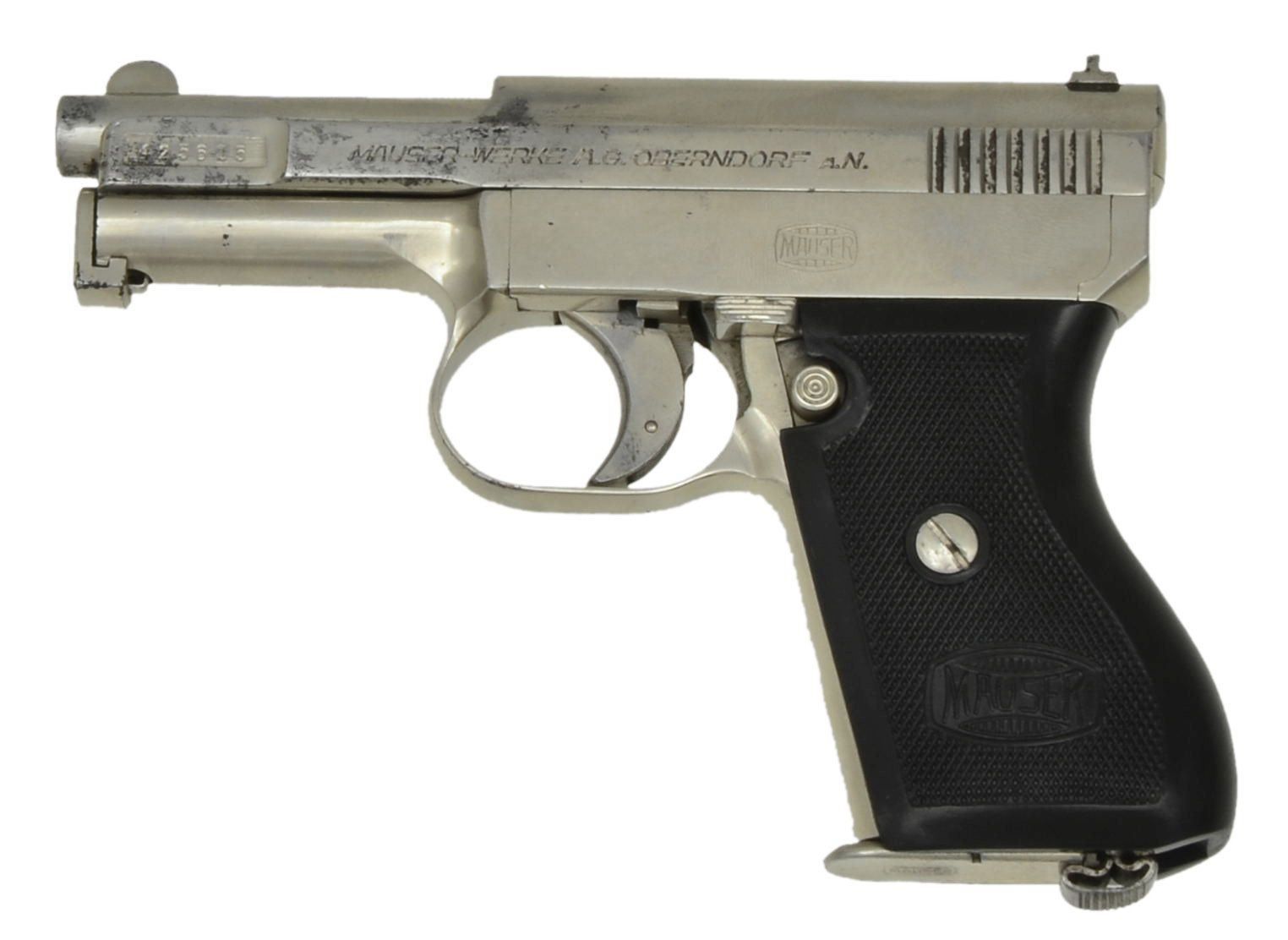 SEMI AUTO PISTOL. Cal. 6.35mm (25 ACP). S# 425615. Bbl. 3". Round blade front sight. U-notch rear sight. Nickel finish. Right side of the gun is marked with crown "U" proofs. Checkered black grips with a Mauser banner MAGS: 1-9 rd., marked with the Mauser banner on the baseplate. CONDITION: grips show some scratches, dings, and handling marks. Metal retains 85% of its original nickel; the loss is mostly due to scattered pitting. The bore has scattered oxidation and a bulge about halfway down. (24-1095/MJC). CURIO. $300-400.