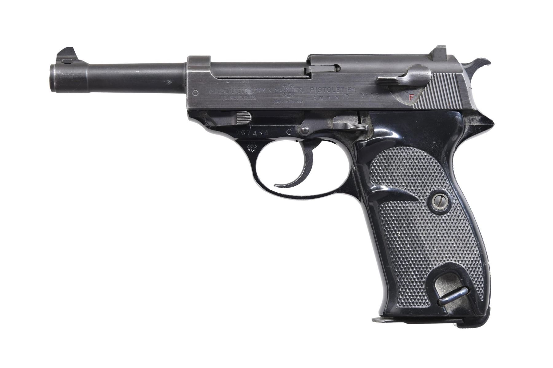 SEMI-AUTOMATIC PISTOL. Cal. 9mm Luger. S# 237454. Bbl. 4 7/8". P1 semi-automatic pistol mfg. in France by Manurhin. Left side of the slide is marked "MANUFACTURE DE MACHINES/ DU HAUT-RHIN" followed by the Manurhin logo, the model and cal. designations, as well as the S#. Right side of slide exhibits three spurious proofs. Left side of the forward trigger guard web is marked with a flower, indicating a West Berlin police issue, with an A.E. Co. import mark present on the right side of the frame. The aluminum receiver exhibits a black anodized finish, with steel components exhibiting a phosphate finish. Frame is mounted with 2-piece checkered black plastic grips. All serialized parts are matching and include the frame, slide, and bbl. MAGS: one 8-rd. CONDITION: metal components retain the majority of their original factory finishes, exhibiting some mild wear and thinning, as well as some superficial handling marks overall. Mirror bore, exhibiting well-defined rifling throughout. Grips show some light smoothing, as well as some superficial marks from handling and storage, but otherwise remain sturdy and serviceable. (24-5494/MLW). CURIO. $200-300.