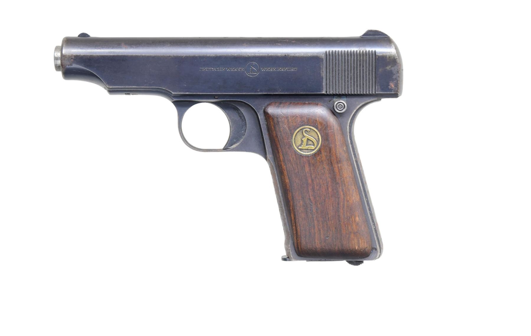 Cal. 7.65mm (32 ACP). S# 185199 (mfg. 1920-1928). Blued finish. 3 1/4" inches barrel length. Fixed front sight, fixed rear sight. Standard frame configuration. Smooth wooden grips with Deutsche Werke medallions. MAGS: 1-8 Rds. CONDITION: Overall condition is good with 70% of the original finish remaining. Slide finish at 70%. Frame finish at 70%. Bore is bright with some wear. (24-4079/MD) CURIO. $150-$250