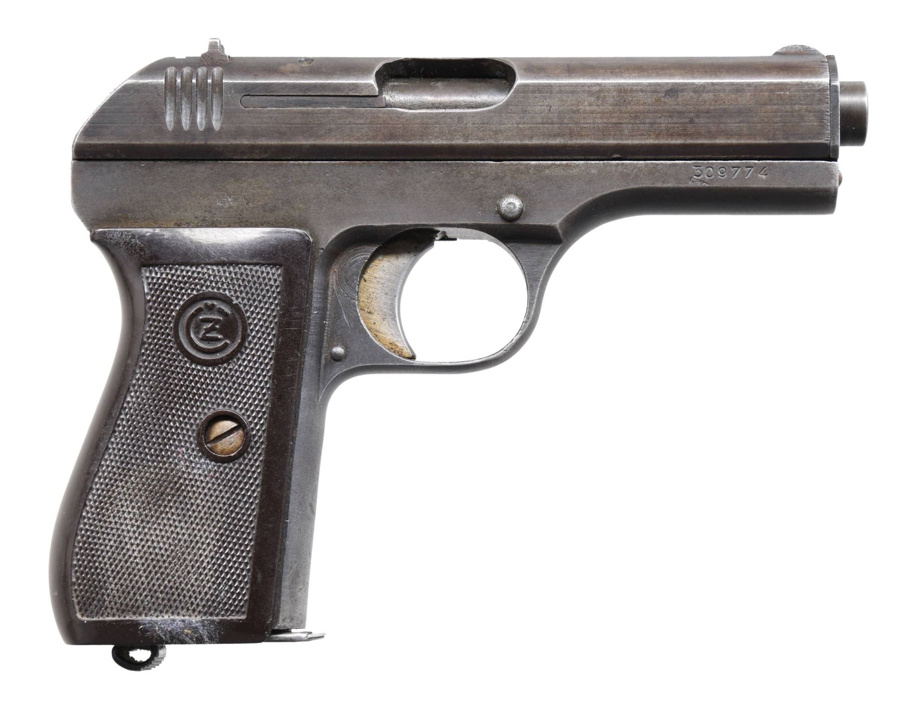 Cal. 7.65mm (32 ACP). S# 309774. Bbl. 4". Round blade front sight. V-notch rear sight. Matching numbers on slide and frame. WWII CZ-27 pistol made under German occupation. Slide has "fnh" marking. Right side of frame has a faint WWII German inspection stamp. Blued finish with strawed trigger. Checkered bakelite groups with the CZ logo. MAGS: one 8-rd., marked "P. Mod. 27" on baseplate. CONDITION: right grip panel has some sticker remnants; grips have some light dings and handling marks. Metal retains perhaps 20-30% original blue, with overall fading to gray, oxidation staining, and some light pitting. Action functions properly when hand-cycled. Good bore with strong rifling but some scattered light oxidation. (24-5471/MJC). CURIO. $300-500.