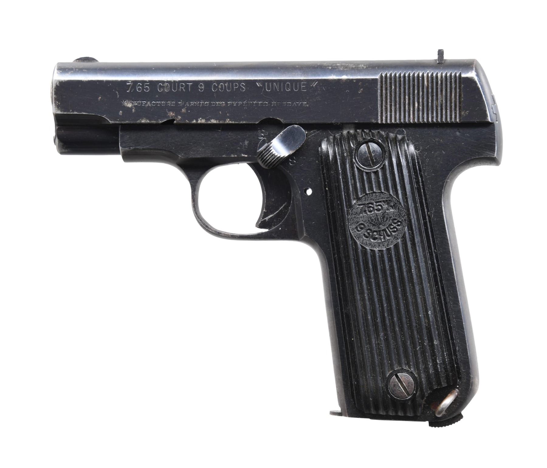 SEMI-AUTOMATIC PISTOL. Cal. 7.65mm. S# 44446. Bbl. 3 1/8". Kriegsmodell semi-automatic pistol mfg. in France by MAPF (Manufacture d'Armes des Pyrenees Françaises) while under German occupation during WWII. Left side of the slide is marked "7,65 COURT 9 COUPS "UNIQUE"/ MANUFACTURE D'ARMES DES PYRENEES HENDAYE." Right side of the frame is marked with the S# above an Eagle/WaA251 acceptance proof. Metal components exhibit a blue finish overall. Frame is mounted with 2-piece grooved black plastic grips. Half-moon blade front sight, with U-notch rear sight. Matching assembly # "171" is present on the frame, slide, and bbl. MAGS: two 9-rd. CONDITION: metal components retain the majority of their original factory blue finish, exhibiting some areas of wear and thinning that show through to gray patina, some scattered spots of pitting, as well as some areas of light surface oxidation overall. Fair bore, exhibiting pitting, while retaining good to strong rifling throughout. Grips show a few scattered marks from handling and storage but otherwise remain sturdy and serviceable. (24-5596/MLW). CURIO. $400-600.