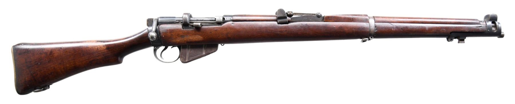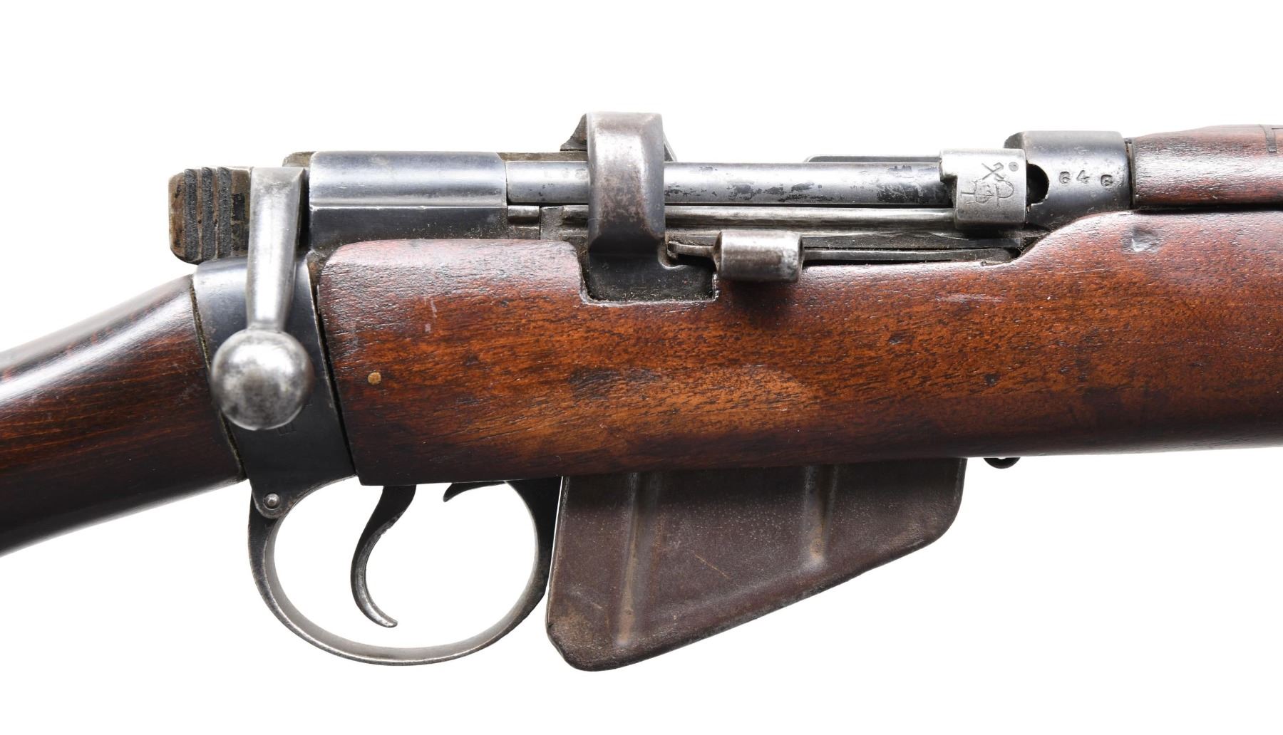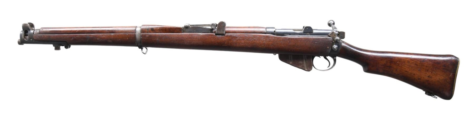 ACTION MILITARY RIFLE. Cal. 303 British. S# G 646. Matching serial number on receiver and bayonet lug. Bbl. 25". Import-marked on left side of receiver. Rifle is marked on receiver ring, bolt head, and under rear sight leaf "DP," indicating the rifle was removed from service but was kept for drill purposes. Receiver is marked on right side of butt socket with worn "crown / GR", "ENFIELD / 1916 / SHTLE" and "III." Receiver has opposed arrows on the left side of the ring, indicating the rifle was sold from service. Receiver is marked on left rear "NRF." Tangent rear sight graduated to 2,000 yards. Blade front sight. Nosecap has protective ears and bayonet mount. Stacking swivel and screw are not present. Receiver fitted with mag. cutoff. Bolt head with vertical notches. Unmarked hardwood stock set with brass trap buttplate. MAGS: one detachable 10 rd. CONDITION: stock set has arsenal rework finish. Buttstock has inletted repairs at heel and toe. Handguard tennons have been removed from sides of rear sight. Rear nosecap screw does not tighten correctly. Metal has traces of blue turning gray and patina with wear and scattered spots of light oxidation. Bore has worn rifling with light pitting and is turning dark in the grooves. (24-5993/RW). CURIO. $300-500.