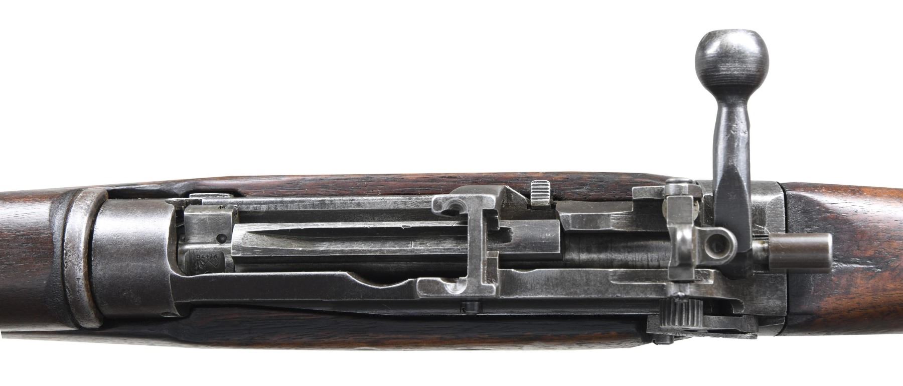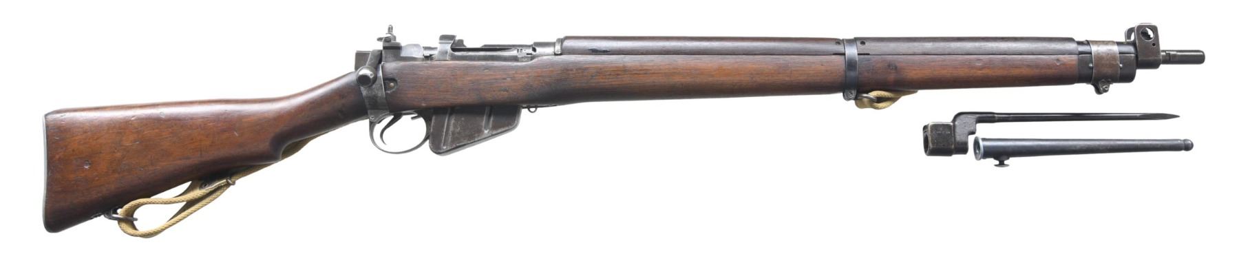 Cal. 303 British. S# AK13369. Bbl. 25". Import marked on bottom of bbl. Receiver is marked on left side w/ the usual "NO. 4 / MKI". Additionally marked w/ importer number "MKI / 84237" & a tiny encircled "C / 35". Flip type rear sight marked "N67" w/ 300 & 600 yard graduations. Blade front sight w/ protective ears. Latch type bolt head release. Smooth sided cocking piece. Walnut stock set w/ alloy trap buttplate. Correct period tan web sling. MAGS: 1 unmarked 10 rd detachable. UNATTACHED ACCESSORIES: 8" round spike bayonet marked on the left side "NO.4 / MKII / S". Round steel scabbard. Bayonet has wear, but appears in good serviceable condition. CONDITION: stock set has worn original finish w/ numerous dents & handling marks w/ light staining. Small doweled repair in right side of buttstock. Forend has 1" crack ahead of trigger guard. Metal has traces of original black finish turning gray w/ the appearance of a light cleaning. Two groove bore has strong lands, but lightly frosted appearance. (24-4851/RW). CURIO. $300-450.