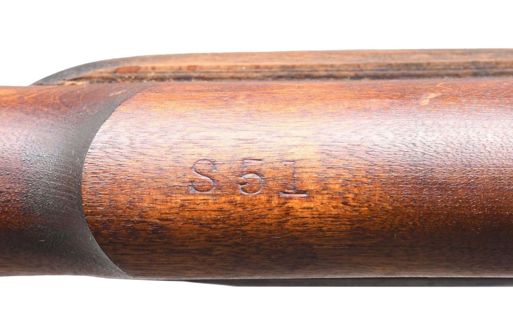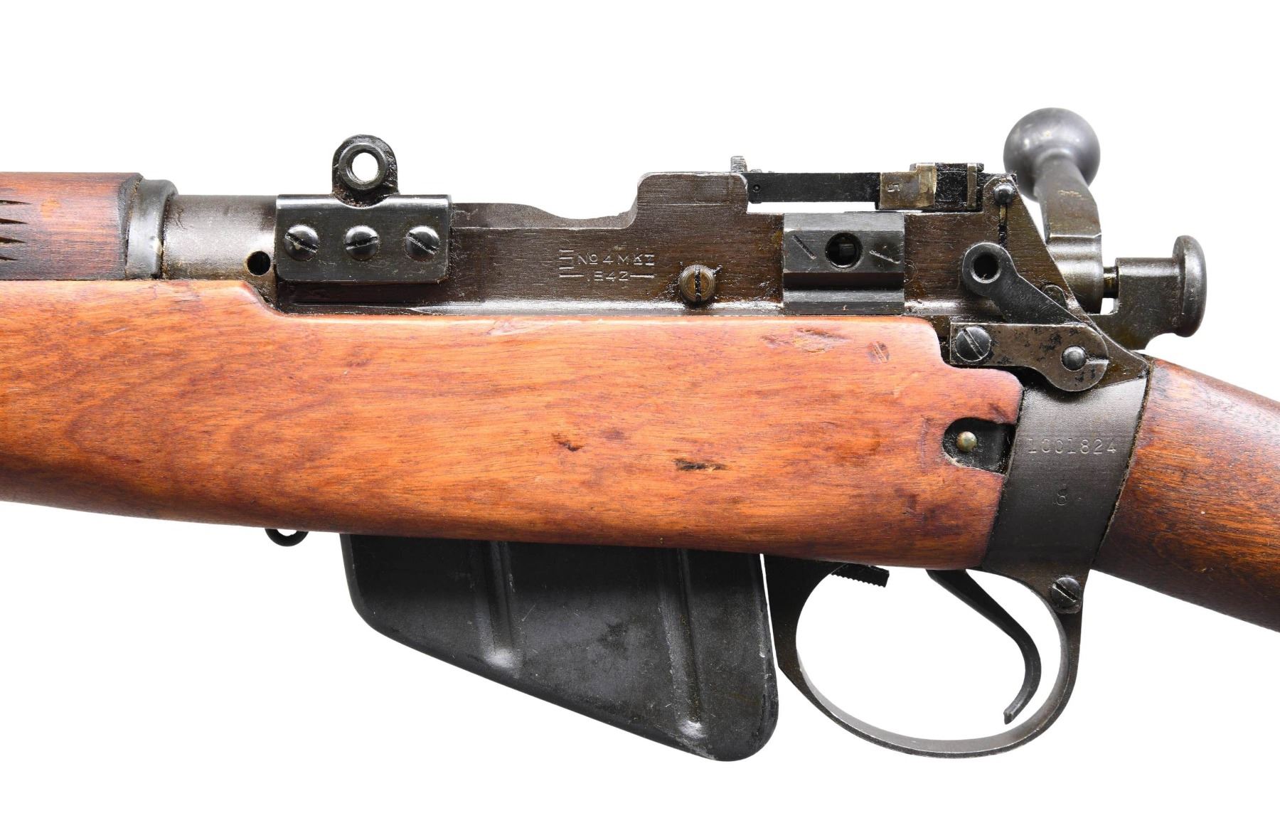 ACTION MILITARY SNIPER RIFLE. Cal. 303 British. S# 10C1824. Serial number matches on receiver & bolt. Bbl. 25". This rifle is prossibly one of those mentioned on page 229 of "The Lee-Enfield" by Ian Skennerton. As stated on page 229, "Some Stevens Savage No. 4 MKI & MKI* rifles were fitted with the mount pads although most of them were not set up with no. 32 scopes, rather put into store as bare rifles.". On page 230 it is stated again that "a small number of the Stevens Savage rifles were converted to sniper models in 1942 and are readily identified by the 'U.S. Property' marking on the left side of the receiver.". This rifle has the "U.S. Property" marking which is partly hidden under the front scope base. The receiver is marked on the left side "S / NO.4 MKI / -1942-". The rifles does not have the "T" sniper marking. The left side of the butt socket does have the tiny "flaming bomb" marking. The receiver ring is marked on the right side w/ "ENGLAND" & "crown" proof. Right side of bbl. has British export proofs. The "S" marked rear sight has had the battle aperture removed correctly. Blade front sight w/ stamped protective ears. The left receiver wall is fitted with the correct bases for the no. 32 scope mount. The receiver is fitted w/ a latch type bolt head release behind the charger bridge. The bolt has the early button head cocking piece. Numerous parts on the rifle have the "S" marking. Hardwood stock set. Buttstock is marked "S51" at bottom behind grip. This marking was used by Holland & Holland when converting these rifles to sniper configuration. Correct wooden cheekpiece held w/ 2 steel screws. Alloy trap buttplate. Rear handguard has longitudinal grooves. CONDITION: rifle shows very little evidence of surface use although the original finish has some light staining & scattered handling marks. Notable small dents on the right side at the lower band. Metal has a large percentage of its original finish, but with some light wear & high point areas. Near excellent 4 groove barrel. (24-4994/RW). CURIO. $600-900.