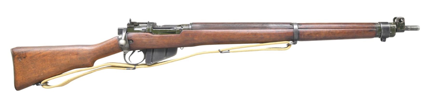MILITARY RIFLE. Cal. 303 British. S# 27C6665. Bbl. 25". Import-marked on right side of barrel. Adjustable aperture rear sight graduated to 1300 yards. Blade front sight with protective ears. Receiver is marked on the left side "U.S. PROPERTY" "No 4 MK1*." Butt socket is marked on left side "S"/"1942"/ with a flaming bomb. Receiver, forend tip, and sight protector have olive green paint. Receiver has cut-out bolt head release. Hardwood stock set, with grooved rear handguard. Brass buttplate. Buttstock is marked under grip "U.C" with a broad arrow. Marked on the right side is "FR," indicating a factory repair in India. Tan, 1943-dated web sling. MAGS. one matching 10 rd., detachable, marked "S." UNATTACHED ACCESSORIES: British No. 4 MKII bayonet with scabbard and tropical canvas frog. CONDITION: stock set has moderate wear, staining, and handling marks. Metal has a small amount of its original finish turning gray with flaking of the painted surfaces. The two-groove bore has a frosted appearance while retaining sharp lands. (24-3821/RW). CURIO. $400-600.