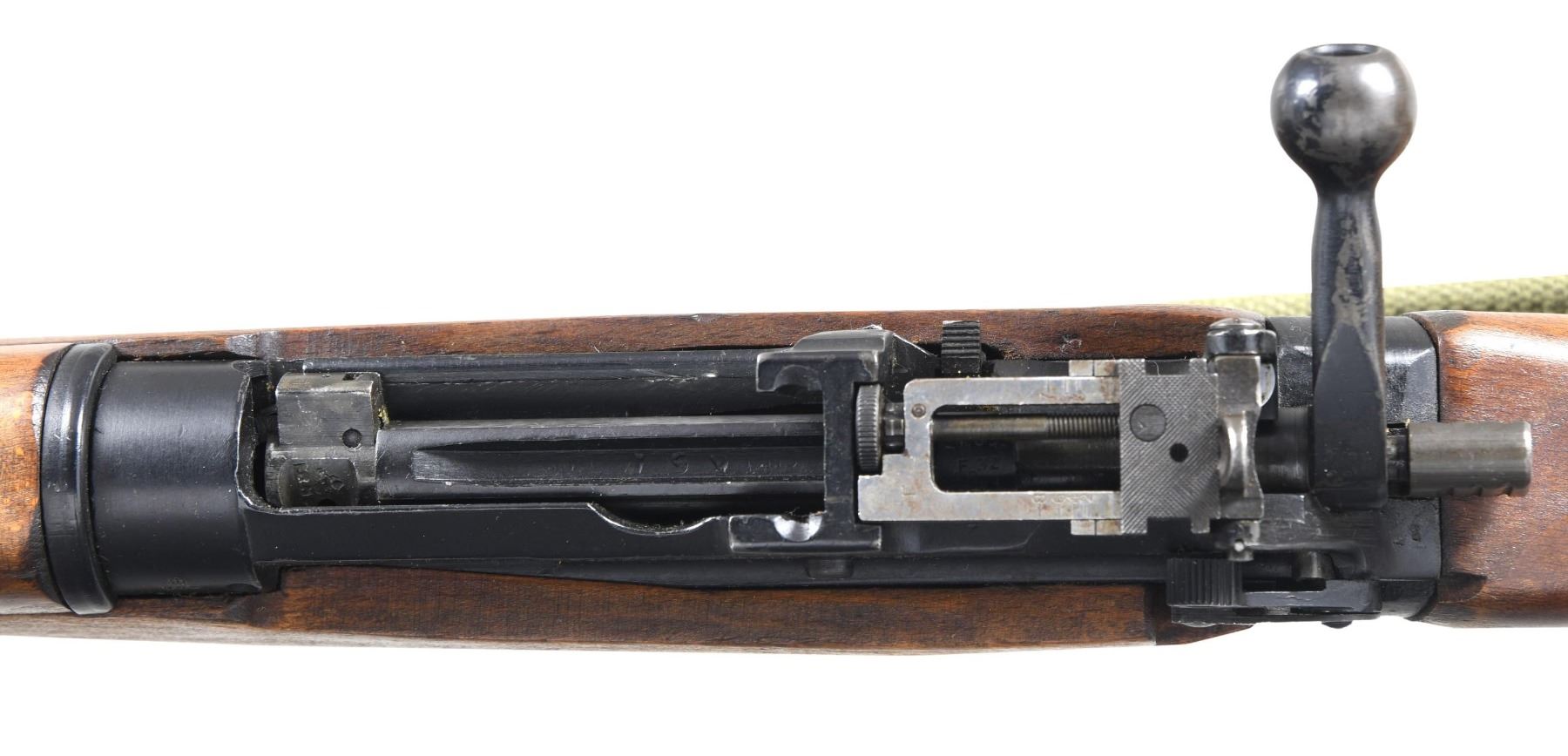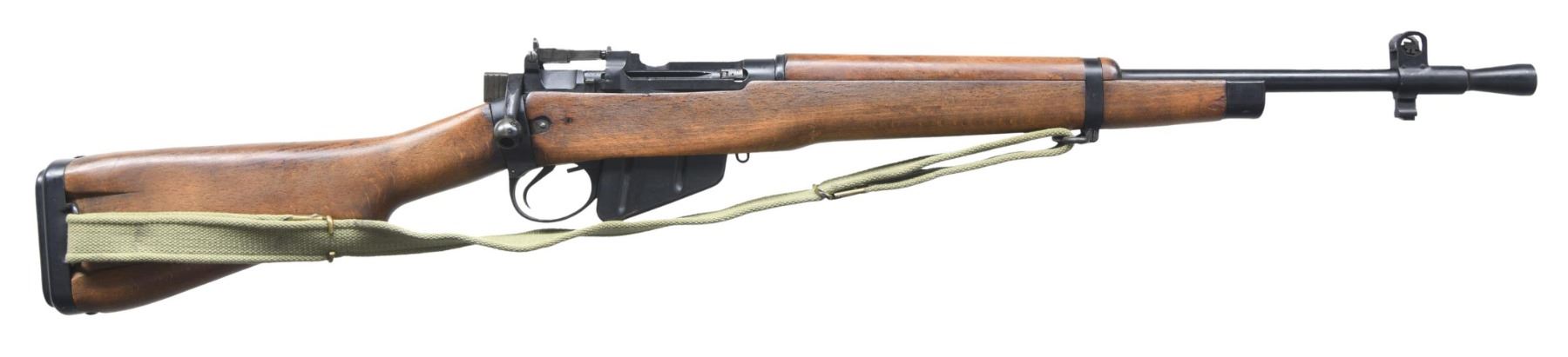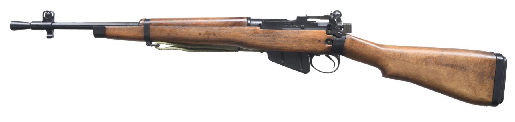 Cal. 303 British. S# AC3784. Serial number matches on receiver, bolt, forend, mag. Bbl. 20 5/8" over cone flash hider. Marked on the top left w/ British export proofs. The No. 5 rifle, also known as the "Jungle Carbine" was not a great success because of the wandering zero problem. This example has the correct features, including the lightning cut on the receiver rail, the hollow bolt knob, the deletion of the boss on the right receiver rail & the lightened trigger guard. Adj. aperture rear sight graduated to the correct 800 yards. Blade front sight w/ protective ears mounted in the combination flash hider & bayonet lug assembly. Rifle is marked on left side of butt socket w/ "broad arrow" & "England". Hardwood stock set. Buttplate is equipped w/ correct rubber recoil pad & sling bar. Forend retained by band w/ sling swivel has metal tip. Green web sling dated 1952. MAGS: 1 matching detachable 10 rd. CONDITION: stock set has light wear, scattered handling marks & several notable scratches ahead of trigger guard & on left side. Metal retains 90% of its original black finish w/ light wear. Very good shiny bore w/ sharp lands. (24-4986/RW). CURIO. $500-750.