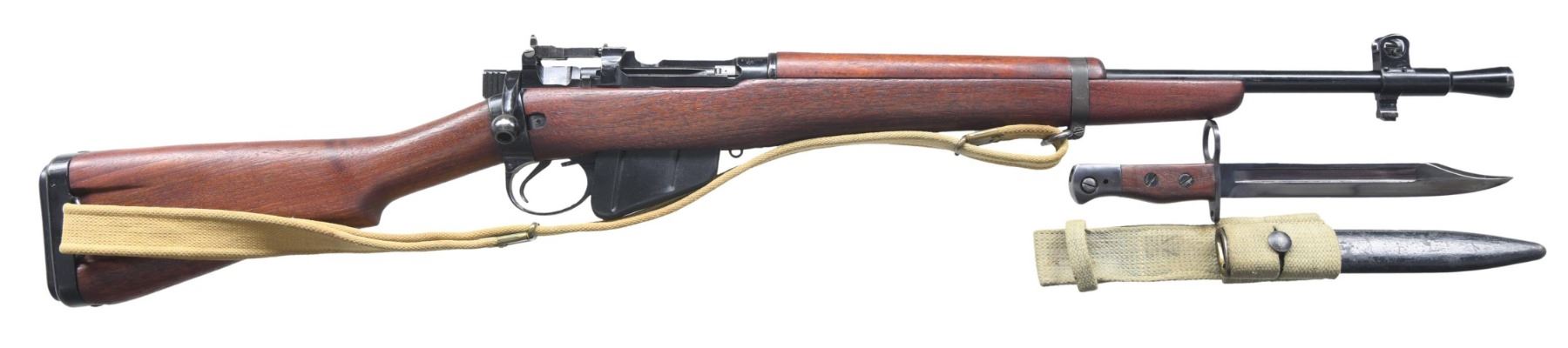 Cal. 303 British. S# R784. Serial number matches on receiver and bolt. Bbl. 20 5/8", including flash hider. Receiver is marked on left rail in electro-pencil "NO5 MKI ROF(F) / 9 / 45" and serial number. Receiver ring marked on right side with "ENGLAND." Rifle has all the correct features for the NO5 rifle, including the lightning cut at the rear of the receiver, the right receiver rail with no mag. cutoff boss, a hollow bolt knob, and a lightened trigger guard. Adj. rear sight graduated to 800 yards. Blade front sight with protective ears mounted on flash hider and bayonet lug assembly. Unmarked walnut buttstock and forend. Handguard is stained hardwood. Buttplate equipped with rubber recoil pad and sling bar. Correct tan web sling. MAGS: one detachable 10 rd replacement. UNATTACHED ACCESSORIES: 8" fullered blade bayonet marked on right ricasso "R.I.". Smooth hardwood grips. Steel scabbard with green web frog. Bayonet is in very good condition, with most of its original finish. Scabbard has a worn, flaking black finish. Frog is stained but serviceable. CONDITION: replacement stock set has light wear and scattered small handling marks. Metal retains an 80% black finish with light flaking and wear. Very good, shiny bore. PROVENANCE: from the collection of Mark Ivey Godfrey. (24-5282/RW). CURIO. $600-900.