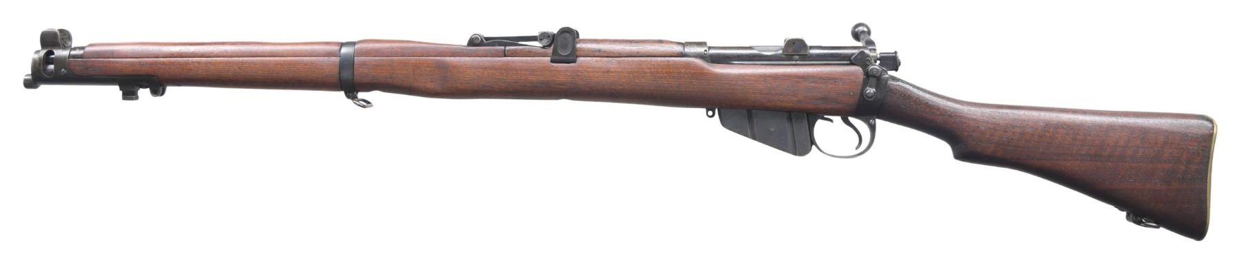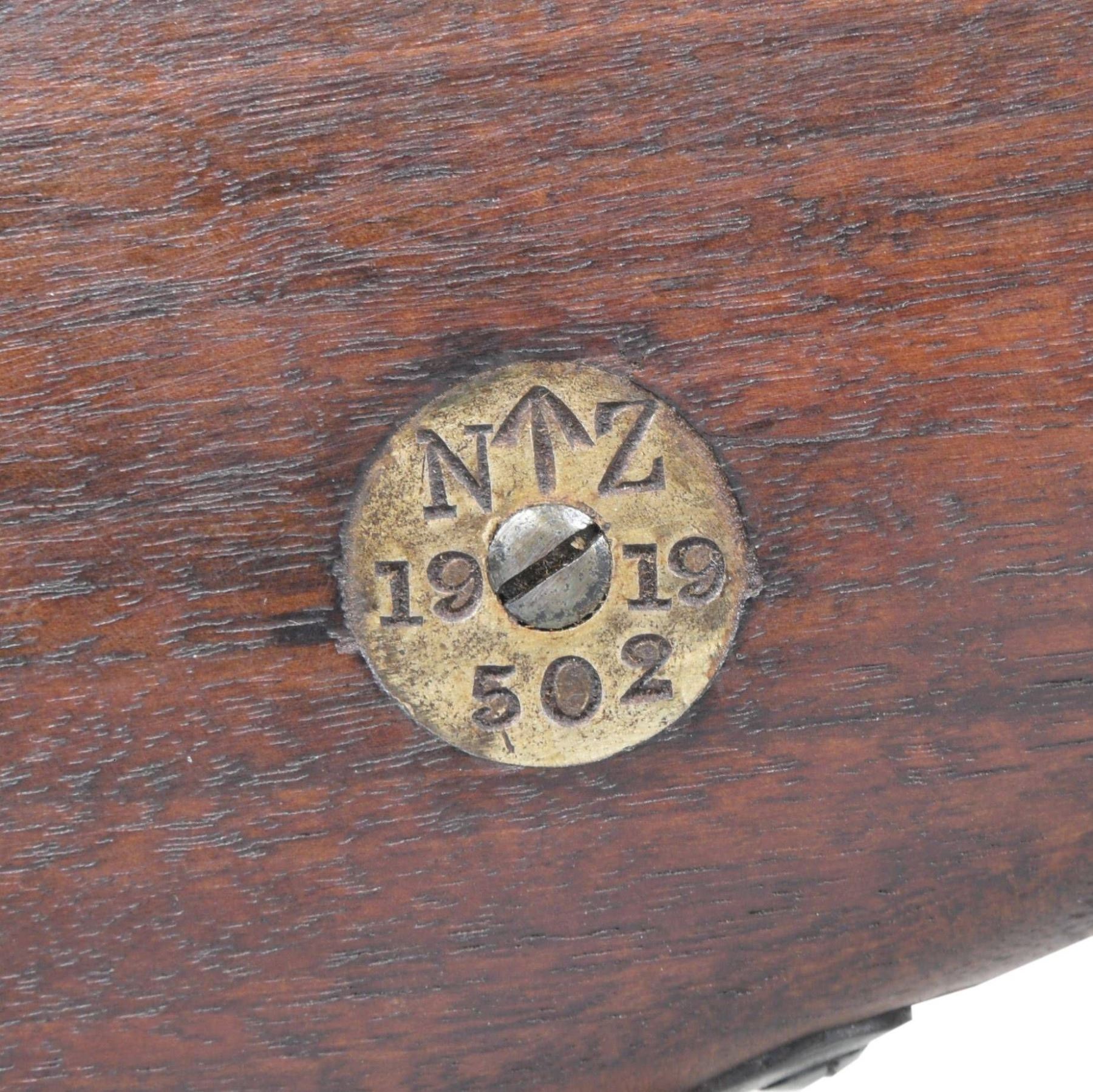 SMLE [MKIV] 22 CAL. BOLT ACTION TRAINING RIFLE. Cal. 22 LR. S# W64578. Serial number matches on receiver, bolt, rear sight, nosecap & forend. Bbl. 25". Appears to be nearly full diameter sleeve. Marked underneath rear sight "HV". Receiver ring marked on left side w/ prominent "NZ" over "view marks". Butt socket is marked on right side "MK. IV. / crown GR / BSA CO / 1915 / SHTLE / III (the 3 is partially lined out) / PATT'14 / NO2". The socket is also marked w/ very faint "A.G. PARKER / BIRMINGHAM". Mag. cutoff is not present. Bolt head is marked ".22 NO2". 2 piece firing pin is offset in bolt face. Tangent rear sight adj. for windage graduated to 2000 yards. Sight leaf has additional 25 & 100 yard marking to accommodate the 22 LR cartridge. Blade front sight. Nosecap has solid protective ears & bayonet mount. Stacking swivel is not present. Walnut stock set. Handguards have their full tennons alongside rear sight base. Buttstock w/ brass trap buttplate is fitted w/ brass disc on right side which is marked "N / broad arrow / Z / 1919 / 502". Detachable mag. which does not match gun. Does not have spring & follower & was used simply as a receptacle for fired cartridge cases. Rifle is referenced on page 489 of "The Lee-Enfield" by Ian Skennerton. CONDITION: stock set has very good original finish w/ very light wear & tiny scattered handling marks. Metal retains 60% original blue finish w/ thinning turning gray. Bore is shiny but with moderately worn lands. (24-4987/RW). CURIO. $500-800.