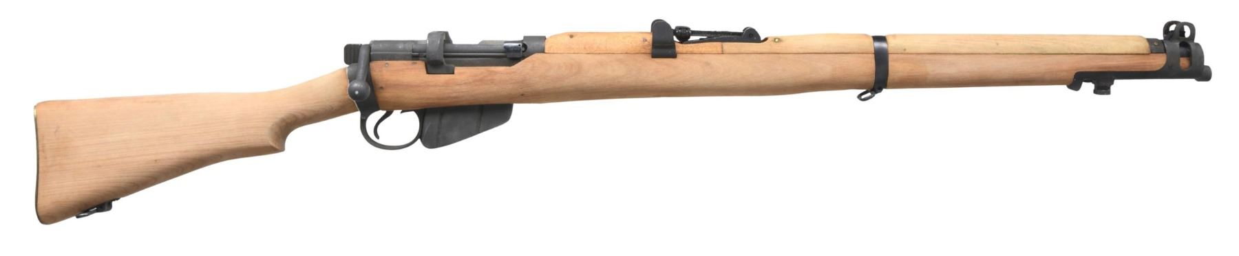 BOLT ACTION SINGLE SHOT MILITARY TRAINING RIFLE. Cal. 22 LR. S# T1777. Numbers match on receiver and bolt. Bbl. 25". Import-marked on left side of receiver. Butt socket is marked on right side "MA / LITHGOW / SMLE / III* / 1945". Tangent rear sight graduated to 2,000 yards. Blade front sight with protective ears. Nose cap fitted with bayonet lug. Bbl. appears to be new mfg. Not relined. Bolt head is marked "22 NO. 2" and has offset firing pin with narrow extractor. The unmarked magazine body has had the follower spring and follower removed, allowing the mag. to catch fired cases. Hardwood stock set. Stock carries acceptance marks but has not had the final coat of finish applied. Brass trap buttplate. UNATTACHED ACCESSORIES: matching cardboard shipping box and importer hang tags. CONDITION: stock set has very light staining and tiny scattered handling marks. Metal retains nearly all of its black phosphate-type finish, with very light high-point wear. Very good, shiny bore with sharp lands. PROVANANCE: from the lifelong collection of Terrence McCarty. (24-405/RW). CURIO. $300-500.