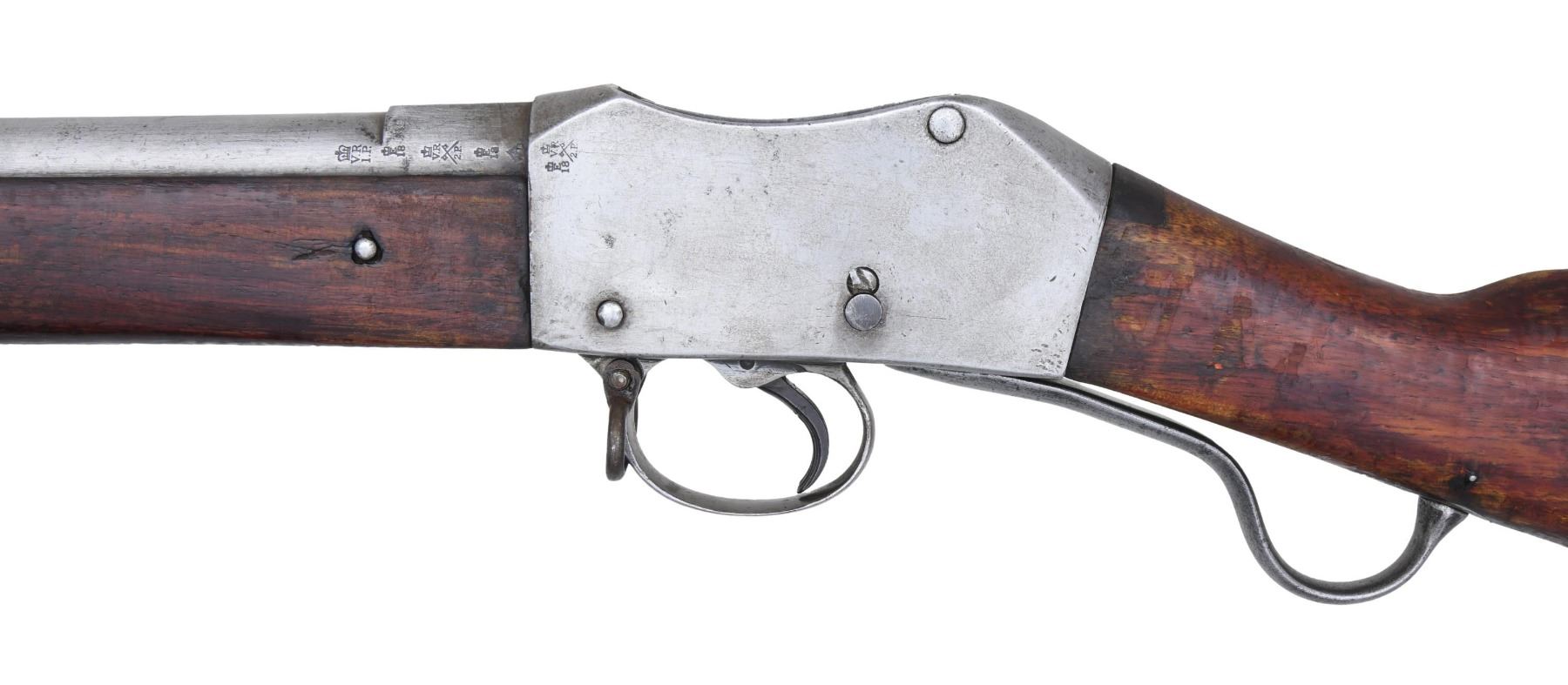 MILITARY RIFLE. Cal. 577-450. NSN. Bbl. 33 1/4". Ladder rear sight graduated to 1,300 yards. Stud type front sight. Receiver is marked on the right side "crown / V.R. / ENFIELD / 1874 / crown over arrow / II." Rifle has numerous view marks. Bayonet lug and cleaning rod are present. Walnut stock set. Stock retains a faint Enfield roundel on the right side with the "II / I" mark. CONDITION: stock set has arsenal rework finish with extensive wear and cleaning. Inletted repair on top of grip behind receiver. Missing chip on left side of bbl. between bands. Metal cleaned to bright is now turning gray with patina and spots of light oxidation. Fair worn bore turning dark in grooves. (01-26000/RW). ANTIQUE. $250-400.