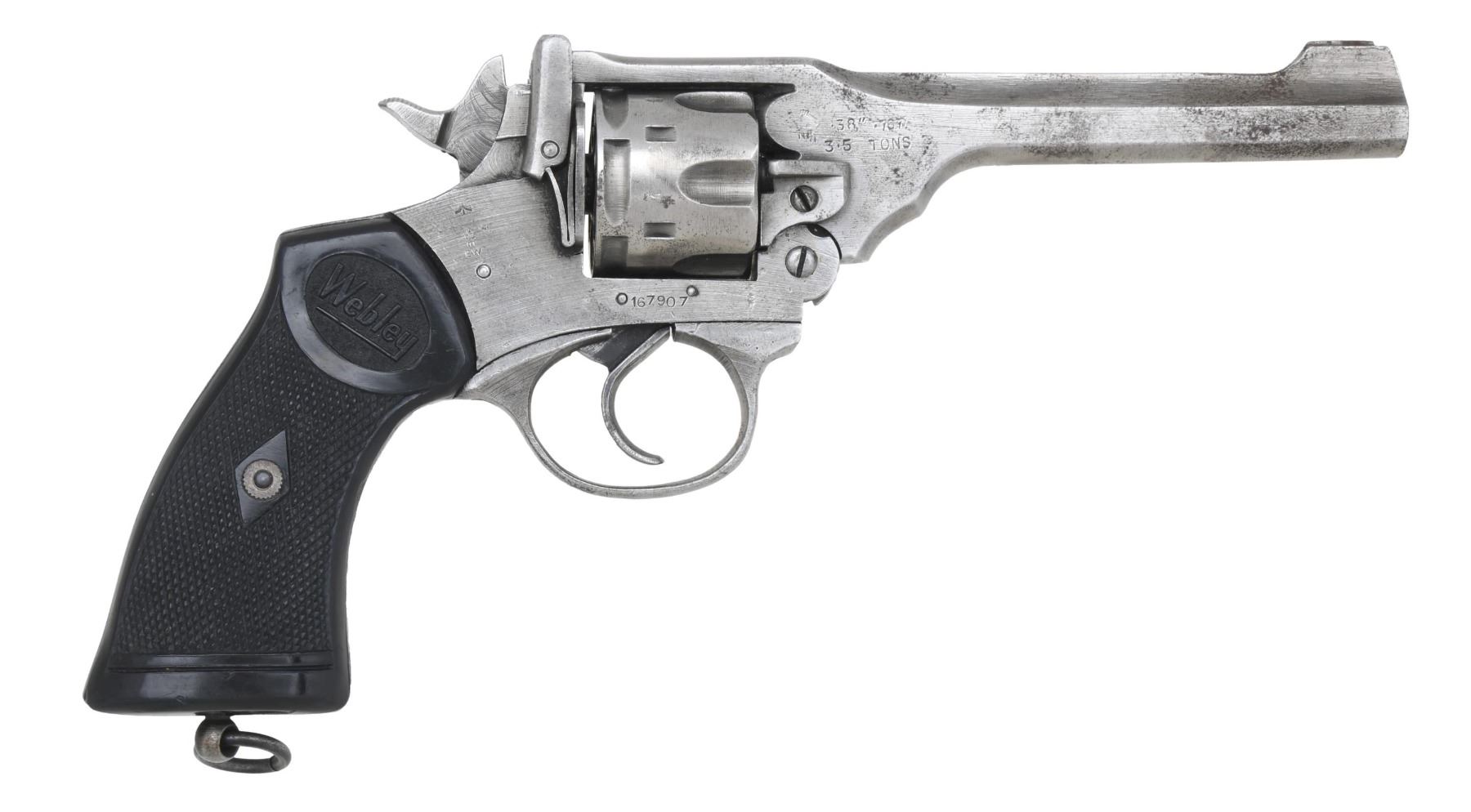 Cal. 167907. S# 167907. Bbl. 5". Mark IV double action revolver mfg. by Webley & Scott. Left side of the bbl.'s top strap is marked "MARK IV .38", with "WEBLEY & SCOTT LTD" marked over the top. Left side of the frame is stamped "WAR FINISH", with the S# marked on the right. British proofs are present overall. Metal components have been cleaned and are in-the-white. Frame is mounted with 2-piece "Webley" checkered black vulcanite grips. Front sight blade has been ground down. All serialized parts are matching and include the frame, cyl., and bbl. CONDITION: good, as in-the-white, with scattered areas of light to mild pitting and surface oxidation. Mirror bore, exhibiting well-defined rifling throughout. Grips show smoothing, as well as scattered marks from handling and storage, but otherwise remain sturdy and serviceable. (24-5984/MLW). CURIO. $200-400.