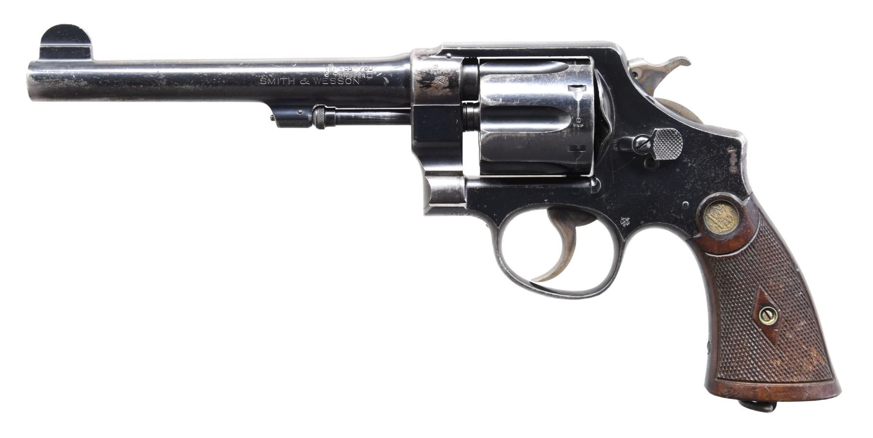 DOUBLE ACTION REVOLVER. Cal. 455 Mark I. S# 21239. Bbl. 6 1/2". .455 Hand Ejector 2nd Model double action revolver mfg. by Smith & Wesson under contract for the British military. Left side of the bbl. is marked "SMITH & WESSON" below British proofs. Frame exhibits numerous British proofs, with the S&W trademark logo marked on the right. Metal components exhibit a blue finish overall, save for on the trigger and hammer, which exhibit a case color hardened finish. Frame is mounted with 2-piece S&W medallion diamond checkered wood grips. Half-moon blade front sight, with frame notched rear sight. Lanyard loop on butt. Matching numbers are present on the frame, cyl., ejector, and bbl. Interior of right grip panel is matching via the full S# in pencil. CONDITION: metal components retain large amounts of their original blue finish, exhibiting some areas of wear and thinning that show through to gray patina, as well as scattered spots of light to mild surface oxidation overall. Mirror bore, exhibiting a few spots of light oxidation and/or pitting, while retaining well defined rifling throughout. Grips show some smoothing, as well as scattered superficial marks and minor impressions from handling and storage, but otherwise remain sturdy and serviceable. (24-4128/MLW). CURIO. $600-900.