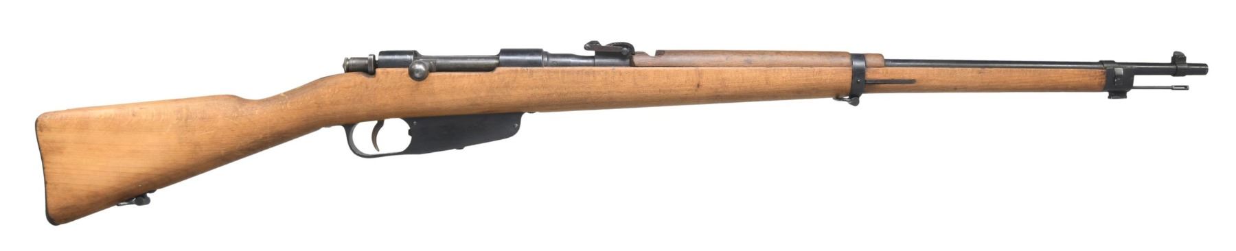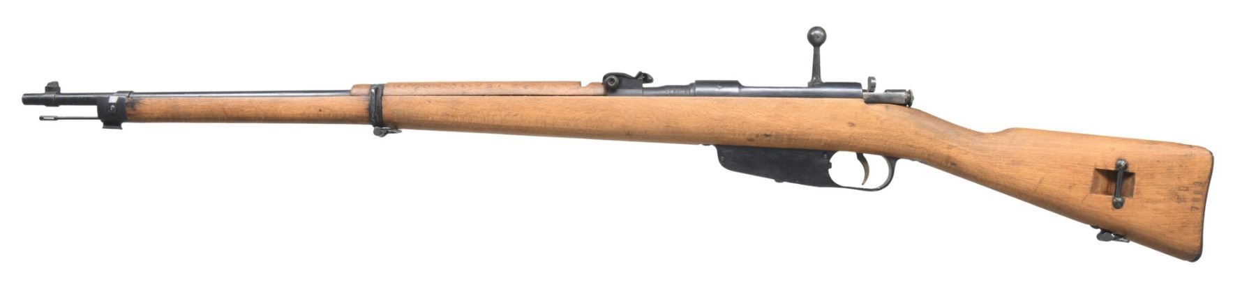 MILITARY RIFLE. Cal. 6.5 Carcano. S# A07003. Matching on bbl. & buttstock. Bbl. 27 1/8". Bbl. marked over chamber w/ boxed "crown / FAT / 42". Tangent rear sight graduated to 1000 meters. Inverted "V" front sight. Straight bolt handle. Cleaning rod is present. Provision for side & bottom swivels. CONDITION: stock set has thin finish giving the appearance of unfinished wood. Metal has 80% lightly worn blue finish w/ wear & handling marks. Bore has lightly worn lands w/ frosted grooves. (24-5065/RW). CURIO. $175-250