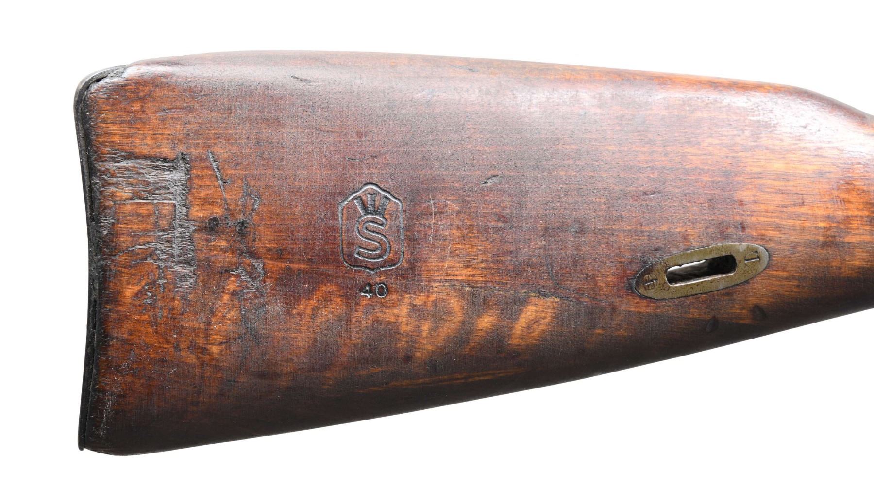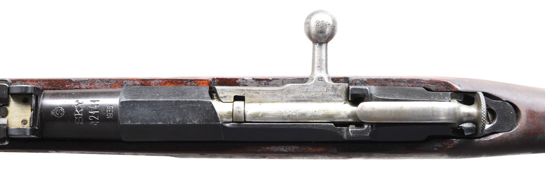 BOLT ACTION MILITARY RIFLE. Cal. 7.62x54R. Matching serial numbers on receiver and bolt. S# SA-42141. Bbl. 27". Import-marked on bottom of bbl. Bbl. is marked on top over chamber with the "S" inside the "gear wheel," which is the SAKO logo, the prominent "SK.Y" civil guard marking, serial number, and "1935." Marked on the right side of chamber "S," flanked by three fir sprigs, and marked on the left side of chamber with a partially struck "AI," which is likely the boxed "SA" property marking. Hex receiver is marked on the left flat "SER:SA-42141." Tangent rear sight graduated to 1,000 meters. Marked on right side of base with the "gear wheel," "S," and three fir sprigs. Windage adj. front sight with protective ears. Cleaning rod is present. Straight bolt handle. Hardwood stock set. Straight grip buttstock, which has the 2-piece construction as well as the rounded finger joints at the forend. Buttstock is marked on the right side with the Civil Guard shield emblem, which contains the "S" and fir sprigs and has the "40" date below. Metal-lined sling slots. CONDITION: stock set has moderate wear, staining, and handling marks throughout, commensurate with extensive, careful service. Metal retains 90% of its original finish with light wear and scattered small spots of oxidation. Does not hold in the cocked position when the bolt is closed and needs gunsmith attention. Very good, shiny bore with sharp lands. (24-5996/RW). CURIO. $300-500.
