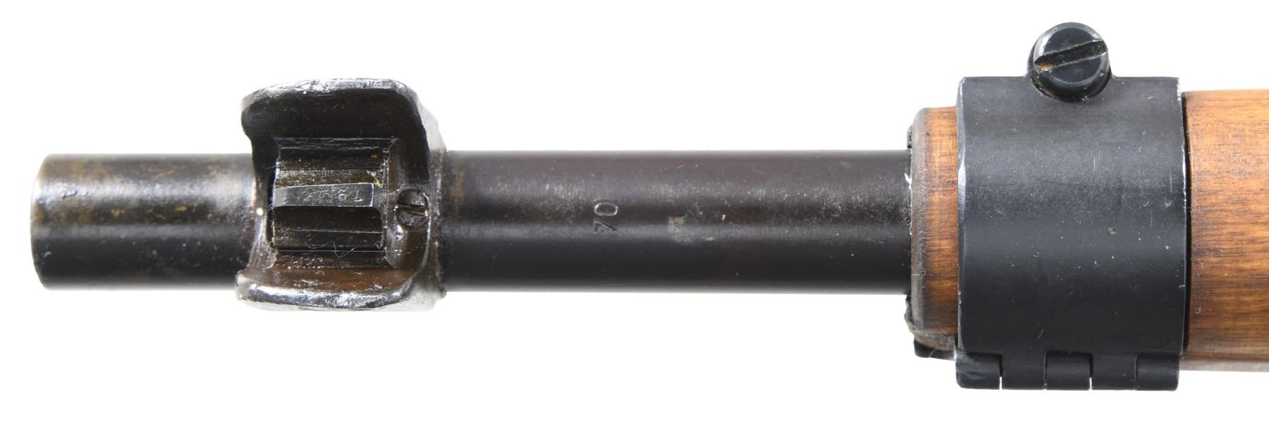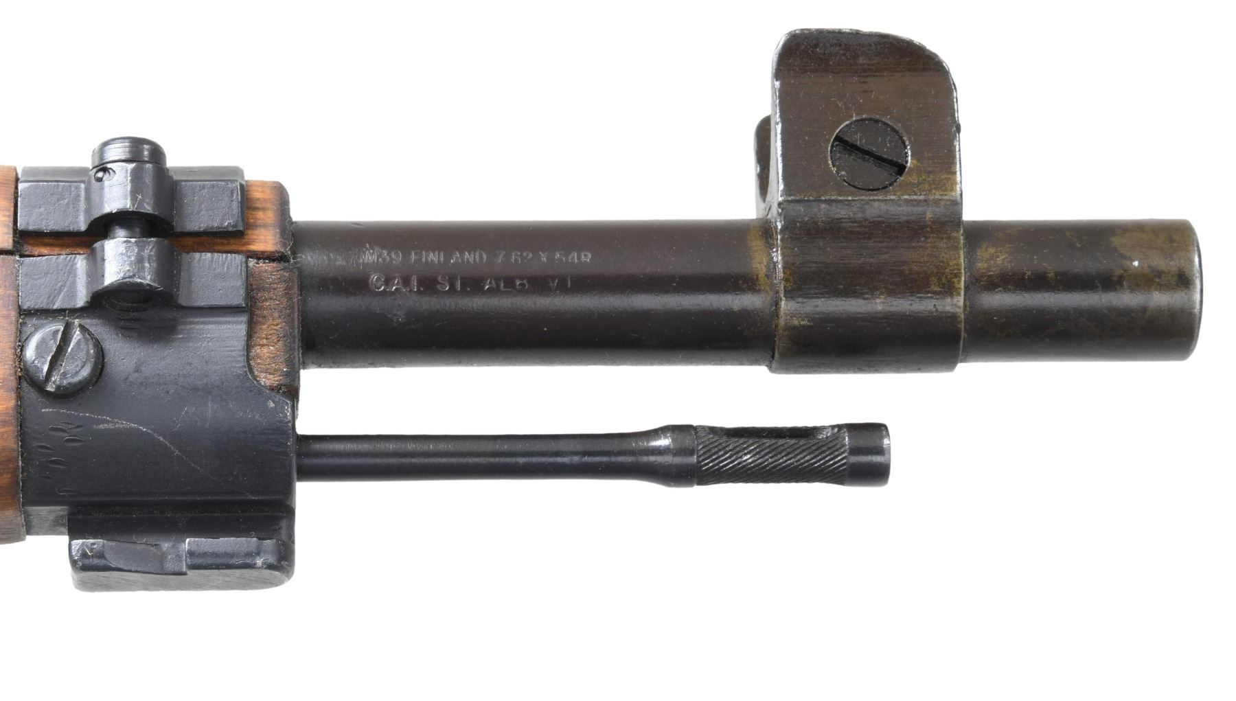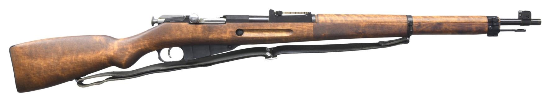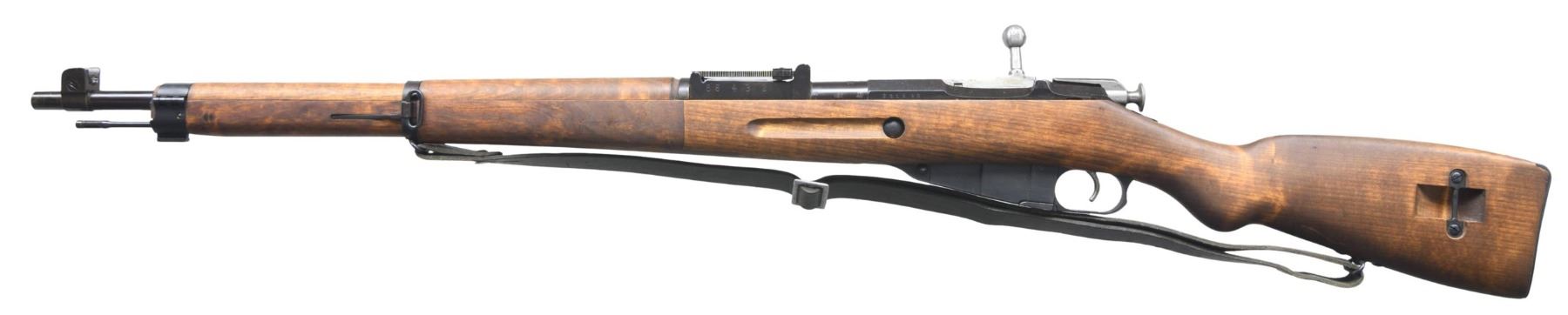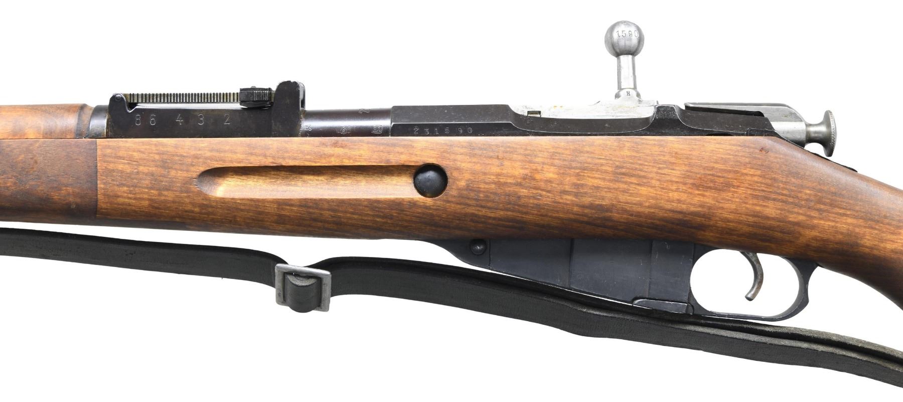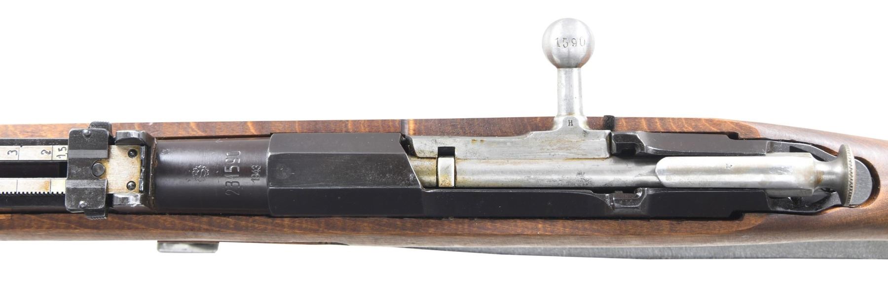 Cal. 7.62x54R. S# 231590. Bbl. 27". Import marked on bottom of bbl. Barrel marked over chamber with SAKO "gearwheel" and dated 1943. Marked on the side with boxed "SA" Finnish property mark. Tangent rear sight graduated to 1000 meters. Blade front sight ,adjustable for windage, has protective ears. Hex receiver has added Finnish S# and shows removal of Imperial eagle on top flat. Straight bolt handle. Cleaning rod is present. Hinged upper band w/ bayonet lug. Unmarked birch stock set made with square end finger joints. Provision for side and bottom sling mounting. Unmarked green leather sling. CONDITION: rifle if not unissued has seen very little use as wood & metal both retain nearly all original finish w/ only very light wear & scattered small handling marks. Shiny bore w/ lightly worn lands & hint of frosting in throat area. PROVENANCE: from the collection of Mark Ivey Godfrey. (24-5226/RW). CURIO. $300-400.