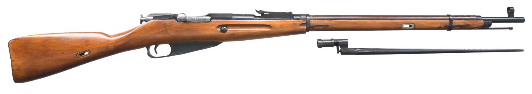 ACTION RIFLE WITH MATCHING BAYONET. Cal. 7.62x54R. S# 9130478483. Original serial number "4643" matches on bbl., bolt, buttplate, floorplate & bayonet. Import marked on left side of receiver. Bbl. 28 3/4". Bbl. marked over chamber w/ Izhevsk hammer & sickle in wreath as well as arrow in triangle. Dated "1931". Tangent rear sight graduated to 2000 meters. Post front sight w/ protective hood. Hexagon receiver. Straight bolt handle. Cleaning rod is present. Non-matching hardwood stock set w/ metal lined sling slots. Buttstock w/ 2 piece toe has faint arsenal rework mark on right side. UNATTACHED ACCESSORIES: 17" quadrangular spike bayonet. Serial number matches the rifle. Bayonet retains most of its arsenal rework finish. CONDITION: stock set has wear, flaking, staining & scattered handling marks. Metal retains a large degree of its arsenal rework finish w/ light wear. Bbl. serial number enhanced w/ white. Bore has lightly worn lands turning dark in grooves. (24-4847/RW). CURIO. $300-500.