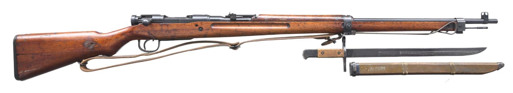 RIFLE. Cal. 7.7 Jap. S# 4114. Bbl. 31". Blade front sight with protective ears. Aperture rear sight with AA wings. Scarce early Nagoya-made "Long" rifle that is longer than the later production Type 99s. Nagoya only made about 8000 long rifles before making short rifles. All matching numbers, including firing pin. Receiver top has intact mum with added white highlight and Type 99 markings. Left side of the receiver has the serial number and Nagoya symbol. Blued finish. Monopod present that is unmarked but appears to be an original correct long type. Asian hardwood stock with two-piece butt, bottom-mounted sling swivels, and repro sling. Underside of stock has strong kanji markings. Celaning rod present. UNATTACHED ACCESSORIES: late war National Denki made Type 30 bayonet with wood scabbard. CONDITION: stock set shows a large gouge on the right side of butt, a few smaller gouges, a notable 3" crack on the left side of the wrist, scattered dings, black staining, and handling wear. Metal has a mix of original and reblued finishes, with some blued-over pitting on receiver, a few other patches of pitting, scattered fading to brown, edge wear, and oxidation. Action functions properly when hand-cycled. Very good, bright bore. PROVENANCE: from the collection of Mark Ivey Godfrey. (24-5256/MJC). CURIO. $350-550.