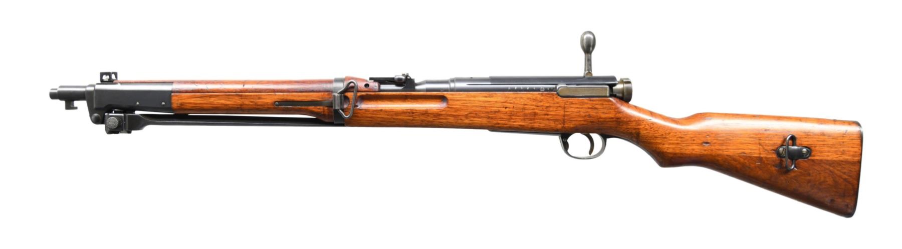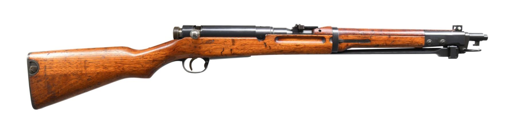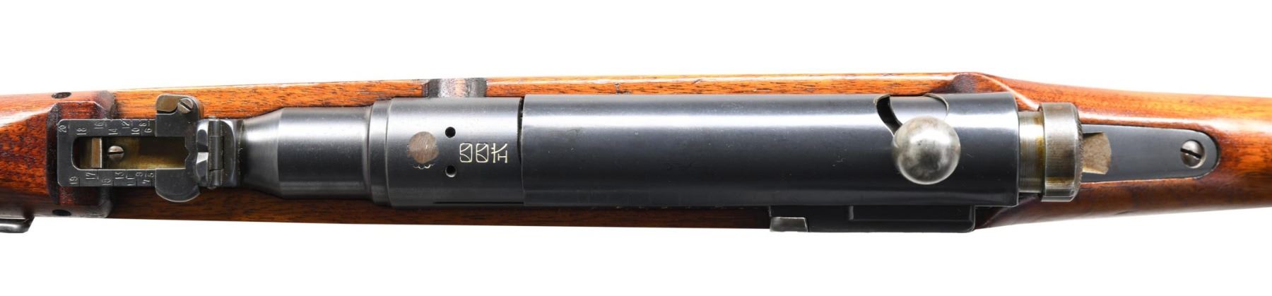 Cal. 6.5 Jap. S# 56924. Bbl. 19". Blade front sight with protective ears. Ladder rear sight graduated to 2000m. Scarce second variant Type 44 carbine made by Kokura with folding spike bayonet. Receiver top has Type 44 markings and ground mum. Receiver markings have added white highlight paint. Matching serial numbers on bolt, safety, bayonet housing, and floorplate. Matching assembly numbers on extractor and bolt latch. Rear sight assembly numbers match themselves, as is typical. Dust cover appears to be unnumbered and reblued. Blued finish with small, strawed parts. Asian hardwood stock set with two-piece butt and left side sling swivels. Underside of butt has strong Kanji markings. CONDITION: stock set retains a high degree of original Urushi finish with scattered dings and handling wear. Metal retains 85% original blue with scattered edge wear, fading, and light oxidation. Action functions properly when hand-cycled. Very good, bright bore. PROVENANCE: from the collection of Mark Ivey Godfrey. (24-5240/MJC). CURIO. $500-900.