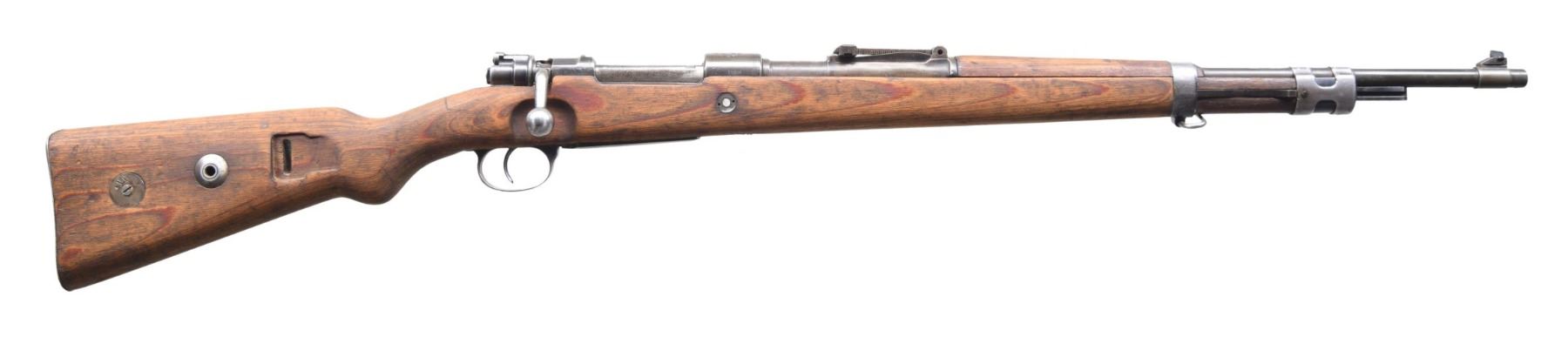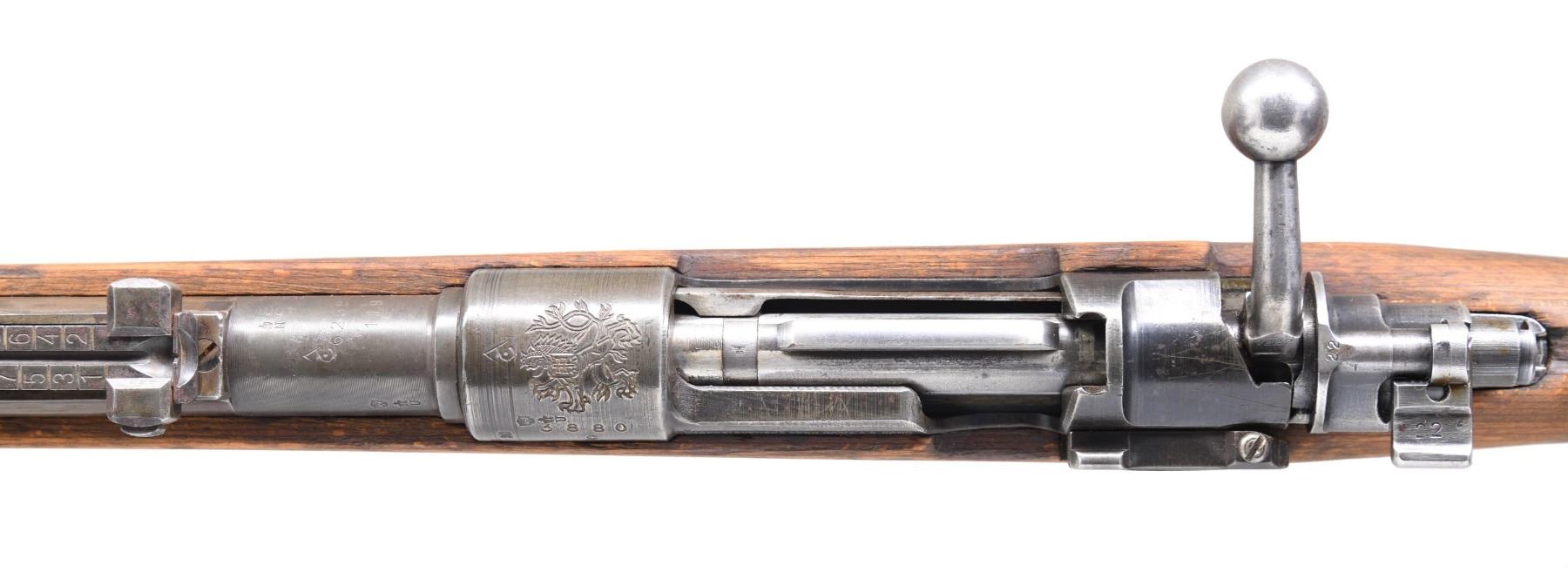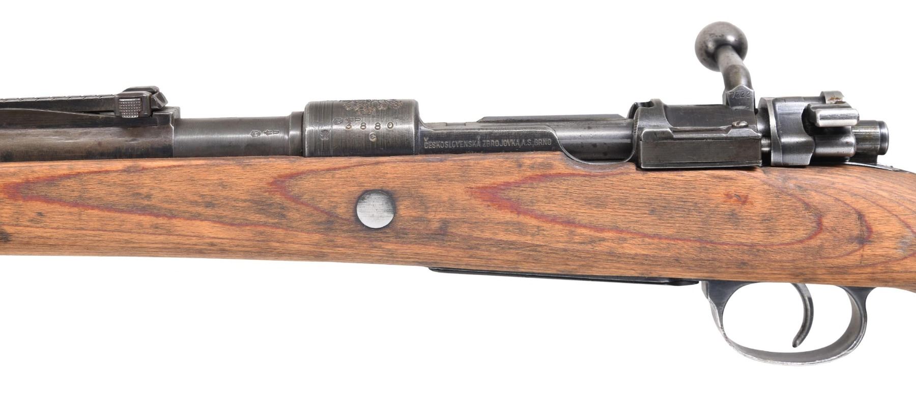 CREST AND IRAQI PROPERTY MARKINGS. Cal. 8MM Mauser. S# 3880c. Bbl. 23 5/8". Import marked on bottom of barrel. Interesting rifle in M98K configuration with Czech rampant lion crest, East German proofs and Iraqi markings. Receiver is marked on top with large "Rampant Lion" crest and Iraqi "Jeem" property mark. Marked on left side with West German proofs and on left rail " CESKOSLOVENSKA ZBROJOVKA A.S., BRNO. Barrel marked over chamber with Iraqi property mark and East German proofs. Tangent rear sight graduated to 2000 meters. Inverted V front sight. Replacement bolt from German 98K. Milled triggerguard assembly. Cleaning rod is not present. Laminated stock set with flat buttplate, steel takedown hole and added steel marking disk on right side of butt. Disk has Farsi numerals "22". Butt has sling slot. Lower band has bottom swivel. "H" type upper band. Bayonet bar is present. CONDITION: stock set has an arsenal rework finish with staining, wear and handling marks. Wrist has transverse repair behind receiver tang. Worn metal is turning grey with some blue remaining in protected areas. Bands are in the white. Bore remains shiny with worn lands and beginnings of frosting in grooves. (24-4145/RW). CURIO. $300-500.