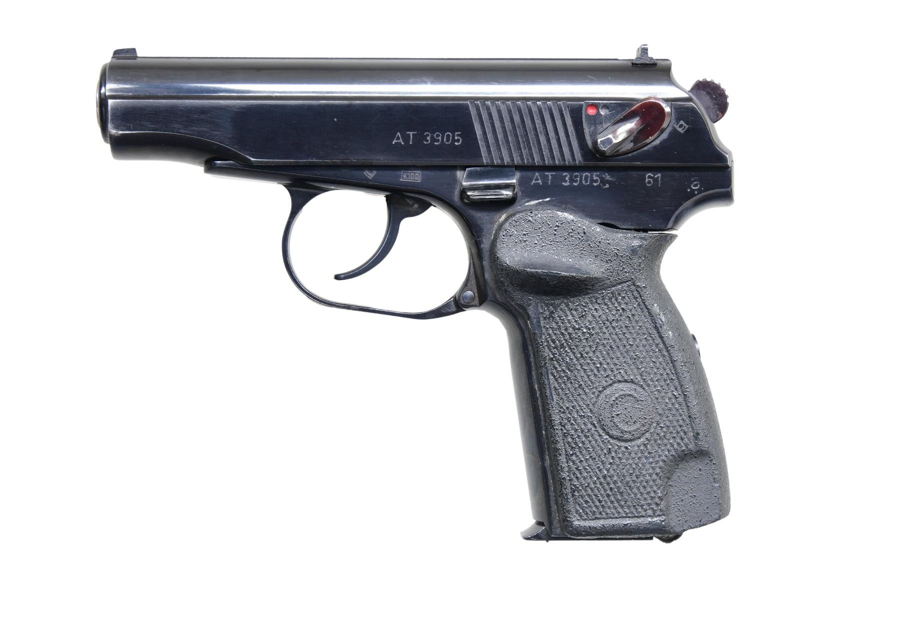 Cal. 9mm Makarov. S# AT 3905 (1961). This firearm features a blued finish. Barrel length is 3.83 inches. Front sight is a fixed blade, and rear sight is a fixed notch. The frame includes import mark, a left-side thumb safety and a magazine release on the bottom of the grip. The grips are black checkered plastic with a lanyard loop. MAGS: 1-8 Rds. CONDITION: Overall condition is very good with approximately 85% finish remaining on the slide and 90% finish on the frame. The bore is bright with sharp rifling. CURIO (24-4072/MD) $300-$500.