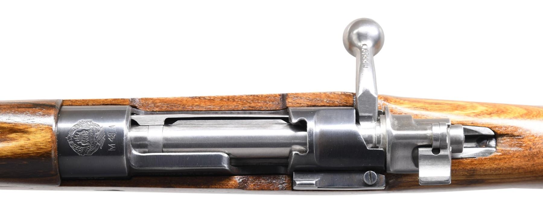 Cal. 8mm Mauser. S# G55190. Bbl. 23 1/2" with Cherry's import marking. Blade front sight with hood. Tangent rear sight graduated to 2000m. All visible matching numbers. Receiver top has post-war Yugo crest and "M48A" marking. Blue finish. European elm stock set with left side sling provisions. Cleaning rod present. CONDITION: refinished stock has an added varnish with some dings and scattered handling marks. Metal retains 95% reblue, with some dings on rear band, scattered edge wear, and some light fading. Action functions properly when hand-cycled. Bright very good bore, with some light frosting. (24-5734/MJC). CURIO. $400-600.