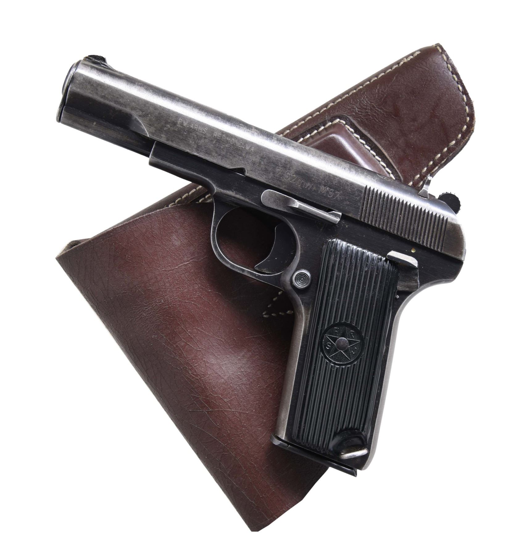 Cal. 7.62x25. S# F202673. Bbl. 4 5/8. Blade front sight. U-notch rear sight. All visible matching numbers. Top of slide has post-war Yugo crest. Left side of slide has PW Arms import marking and "7.62mm M57" marking. Left rear of frame has importer added manual safety. Blued finish. Grooved grips with Communist star monogram. Left side of grip frame has lanyard ring. MAGS: two 9 rd. UNATTACHED ACCESSORIES: green Com-Bloc holster. CONDITION: grips show some light dings and handling marks. Metal retains 40% arsenal blue with some light dings, some light pitting, scattered edge wear, and fading to gray. Action functions properly when hand-cycled. Bore shows scattered oxidation and pitting but strong rifling. (24-4839/MJC). CURIO. $300-450.