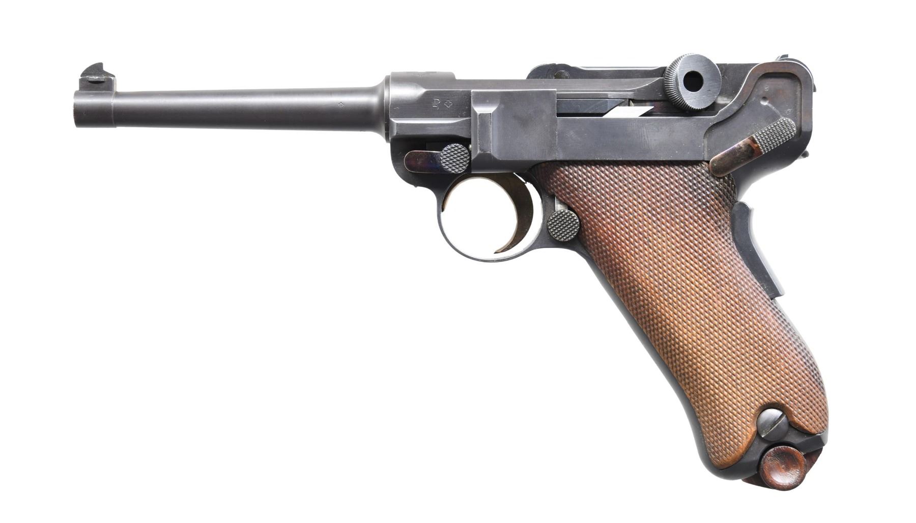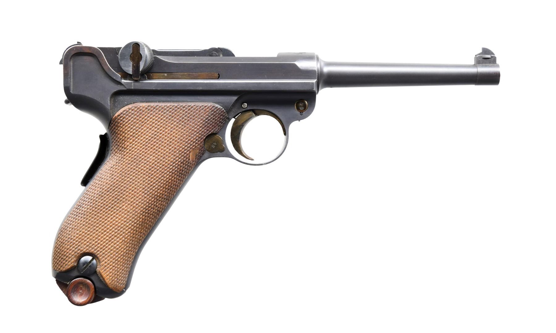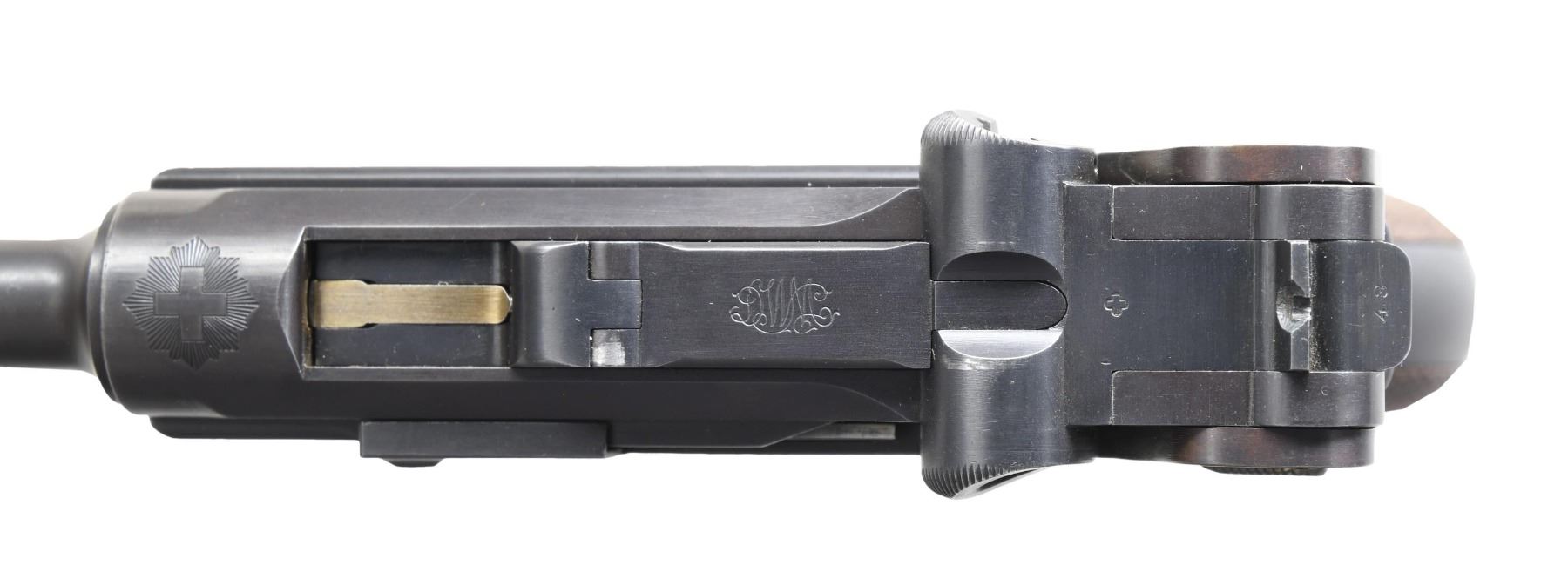 SEMI-AUTOMATIC PISTOL. Cal. 30 Luger. S# 543. Bbl. 4 3/4". Model 1900 Luger mfg. by DWM for sales in Switzerland. Top of the bbl. extension is marked with a Swiss Geneva cross within a sunburst, with a "P" and small Swiss Geneva cross marked on the left. Toggle is marked with the intertwined "DWM" monogram. Left side of the frame has had an "S" and "F" added at their respective positions at the safety lever. Metal components exhibit a dull reapplied blue finish overall, with strawed parts having been reheated. Frame is mounted with 2-piece checkered wood grips. Old Model frame & breechblock, with anti-rebound arm and dished toggles. Blade front sight, with later modified U-notch rear sight. All serialized parts are matching in the early commercial (hidden) fashion and include the frame, takedown lever, sideplate, grip safety, bbl., bbl. extension, breechblock, toggles, as well as the grips. MAGS: 1 later production 8-rd. CONDITION: excellent, as refinished, with metal components retaining virtually all of their reapplied dull blue finish overall. Mirror bore, exhibiting strong rifling throughout. Grips show some smoothing and a few marks and impressions from handling and storage, but otherwise remain sturdy and serviceable. (24-4124/MLW). CURIO. $500-900.