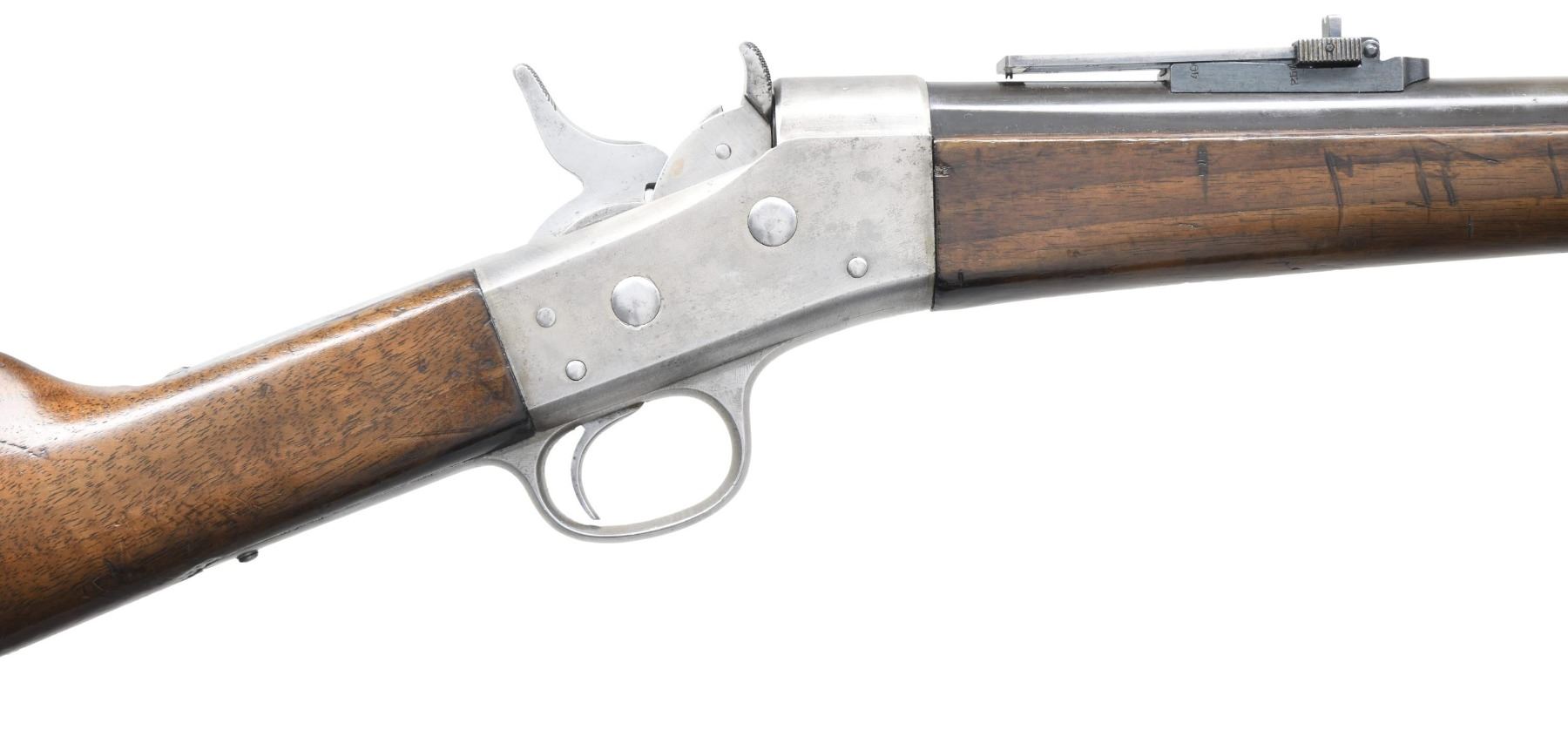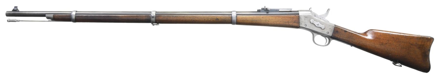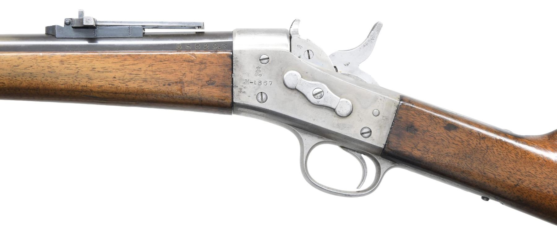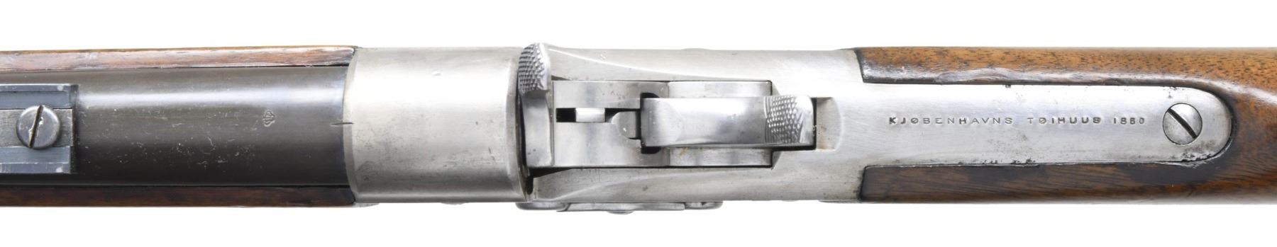 MILITARY RIFLE. Cal. 11.35 CF. S# 58529. Bbl. 35 3/8". Bayonet bar on right side of bbl. Ladder rear sight with auxiliary volley notch. Volley sight is present on the middle bbl. band. Front sight base has been modified to standard 3/8" dovetail and is fitted with a Lyman brass bead front sight. The rolling block action is in-the-white and marked on the left side with the royal cipher over "M-1867". The breech block with its firing pin retractor has the dual holes for the firing pin as converted to centerfire. The receiver tang is marked "KJOBENHAVNS TOJHUUS" and "1880." Cleaning rod is present. European walnut buttstock and forend. Buttstock has acceptance mark at heel and unmarked brass disc on right side. Royal crown on left side of grip. Forend has three bands retained by springs. CONDITION: stock set has an added finish over the worn original finish, with numerous handling marks and several vertical dents on the right side of the forend. Break receiver has small areas of gray. Bbl. has traces of blue turning gray. Balance of parts are mostly gray. Very good, shiny bore. (01-25884/RW). ANTIQUE. $500-800.